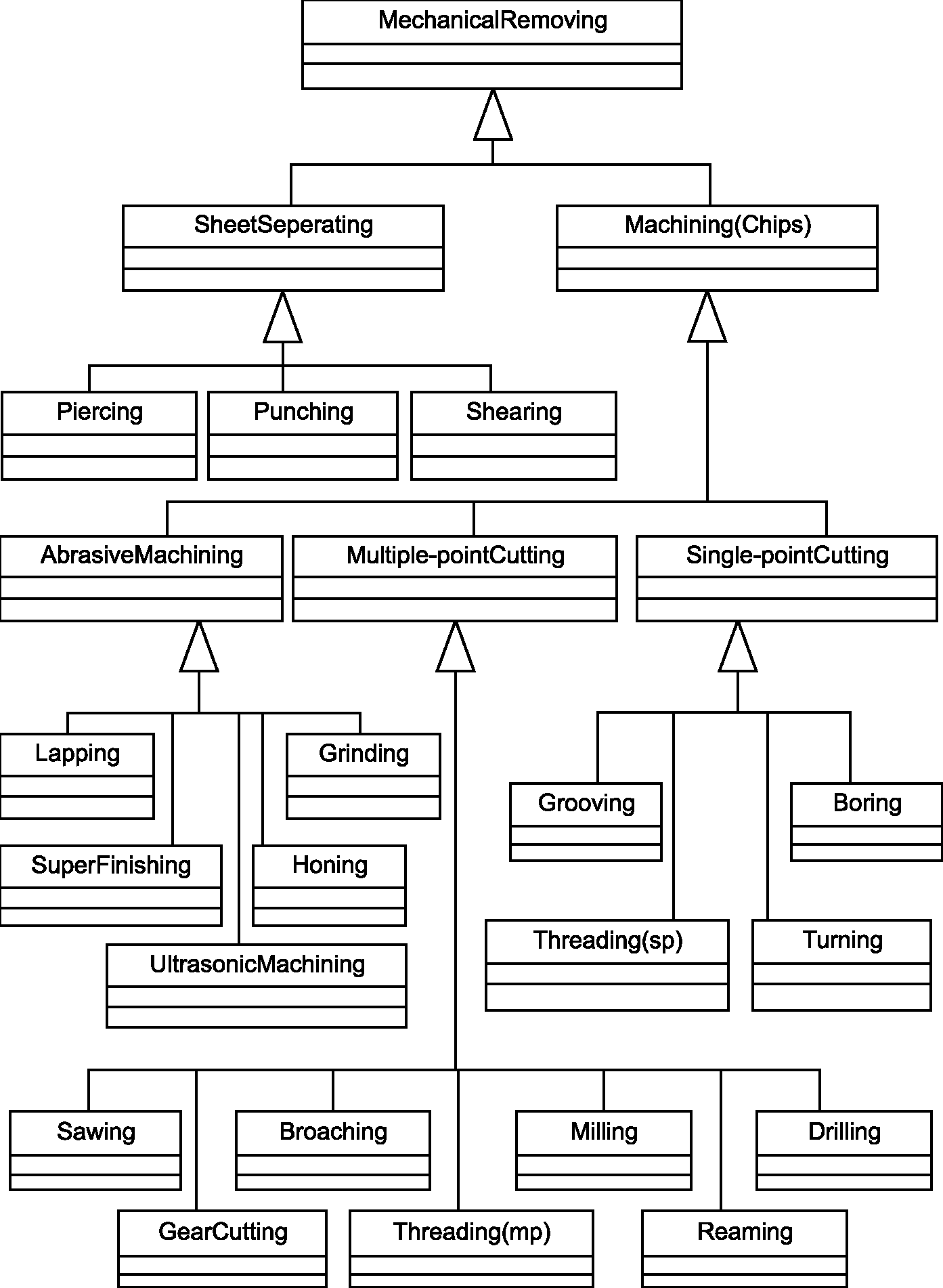 рисунке B.11. Класс MechanicalRemoving представляет собой действие по удалению лишнего материала с обрабатываемой детали с использованием механических методов, например обработку на станке или резку. Существуют два производных класса: разделка листа (SheetSeparating) и обработка на станке (Mashining). При разделке листа (SheetSeparating) используют методы резки металлического листа. Специальными методами являются прокол, перфорирование и строгание. Обработка на станке (Mashining) является действием разрезания металла с помощью резца. Этот класс включает в себя три производных класса: одноточечная резка (SinglePointCutting), многоточечная резка (MultiplePointCutting) и абразивная резка (Abrasive). Одноточечная резка (SinglePointCutting) включает в себя расточку, токарную обработку, проточку канавок и нарезку резьбы. Многоточечная резка (MultiplePointCutting) включает в себя сверление, развертывание, фрезеровку, многоточечную нарезку резьбы, прошивку, зубонарезку и распилку. Абразивная резка (Abrasive) включает в себя шлифование, хонингование, обработку ультразвуком, чистовое шлифование и притирку.