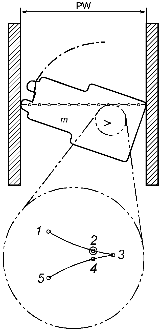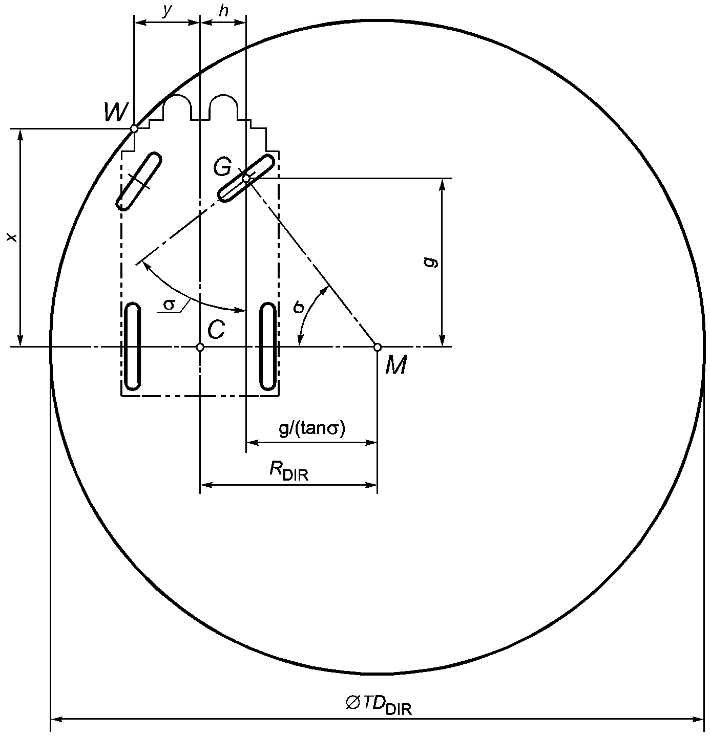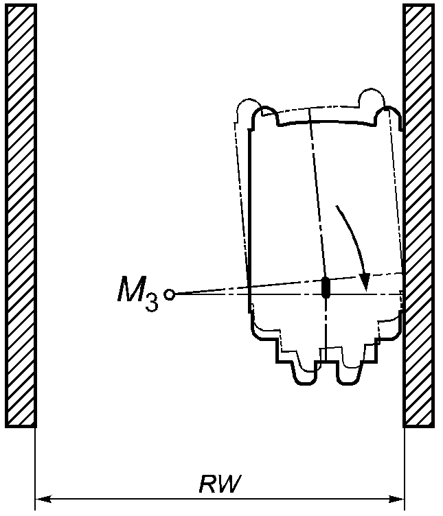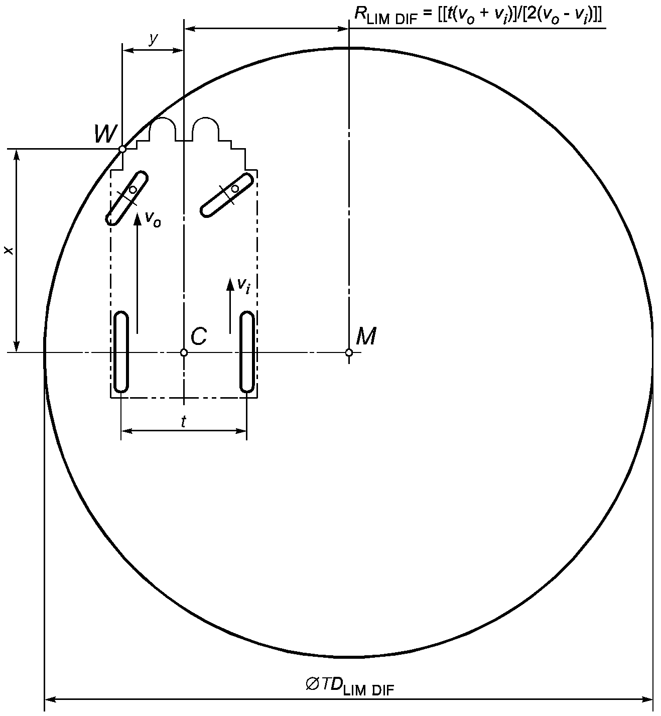 - минимальный диаметр вращения кресла-коляски с ограниченным рулевым управлением, равный удвоенному расстоянию между точками M и W (см.