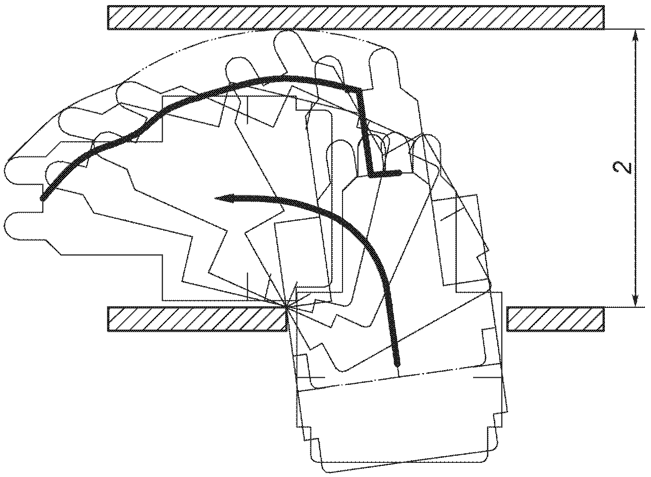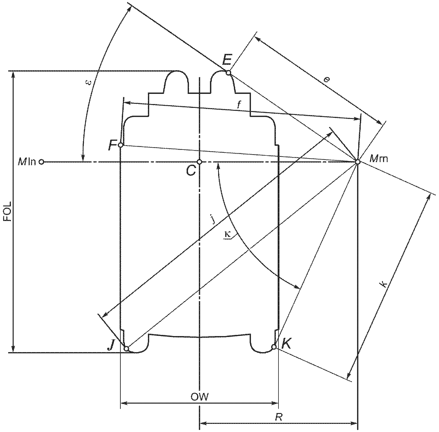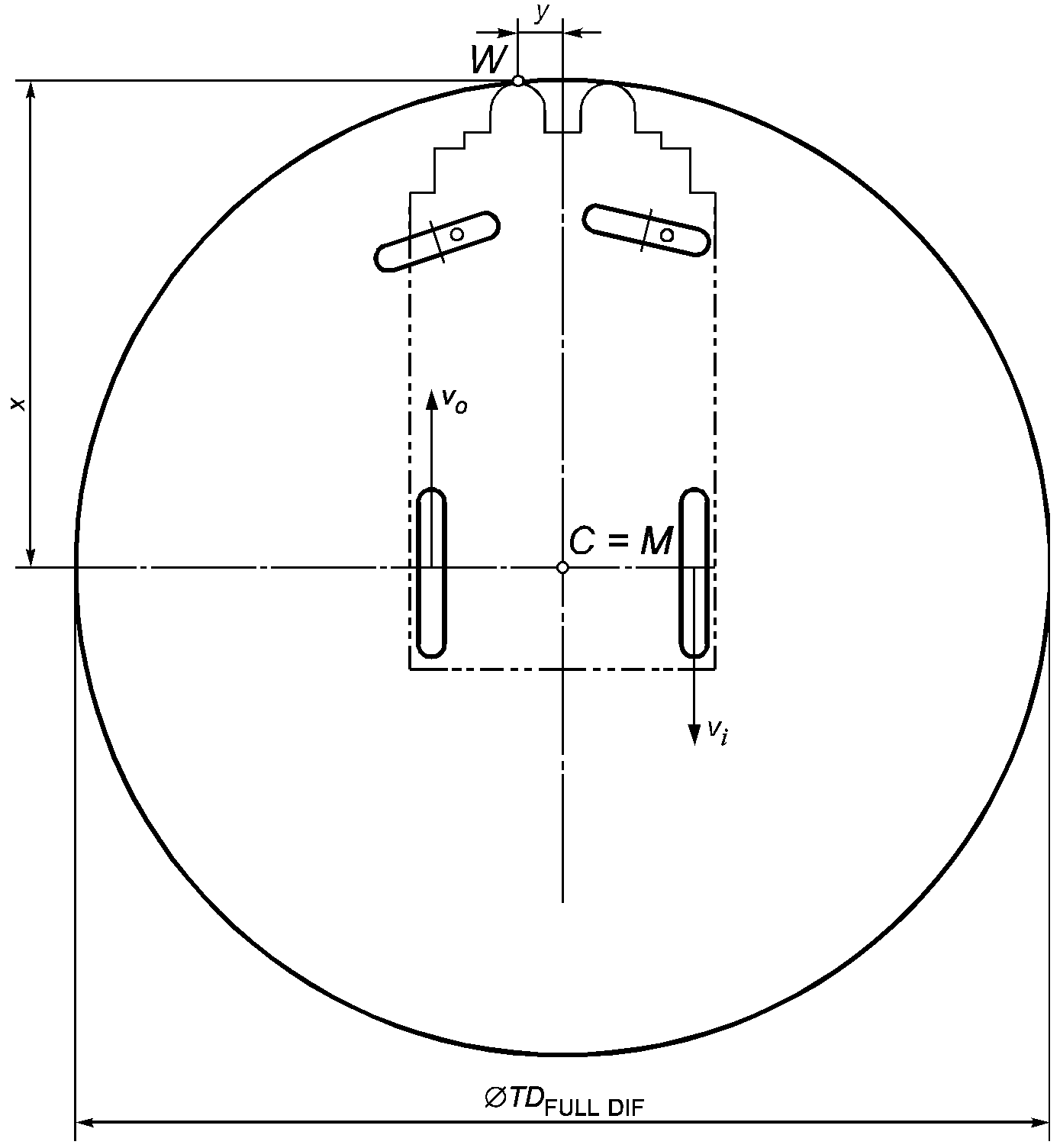 - минимальный диаметр вращения кресла-коляски с ограниченным рулевым управлением, равный удвоенному расстоянию между точками M и W (см.