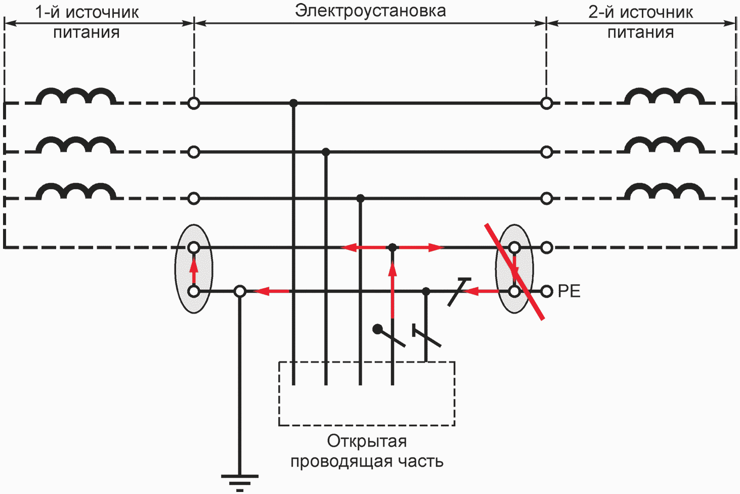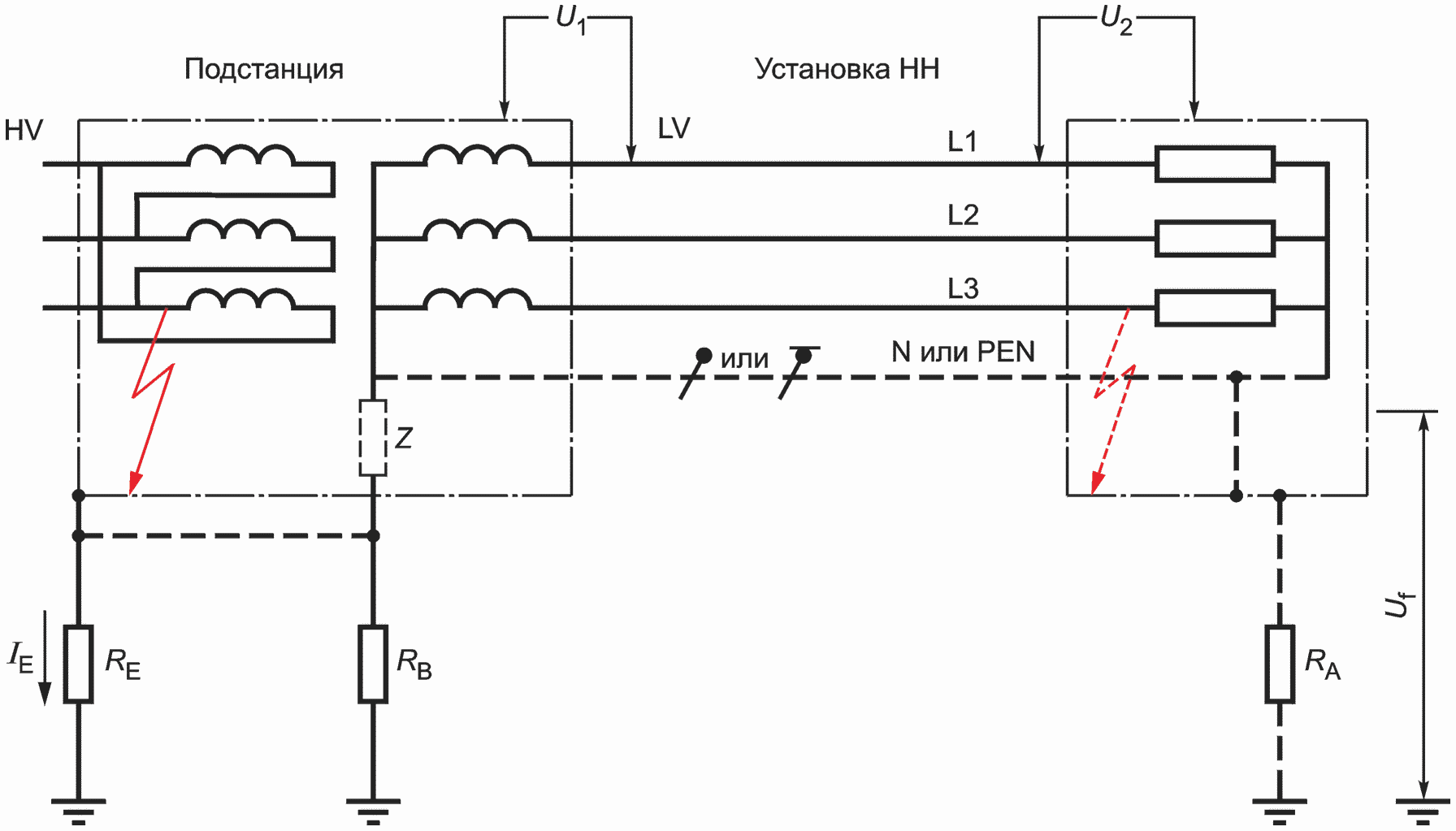 - замыкания на землю в высоковольтной системе трансформаторной подстанции, питающей низковольтную установку);