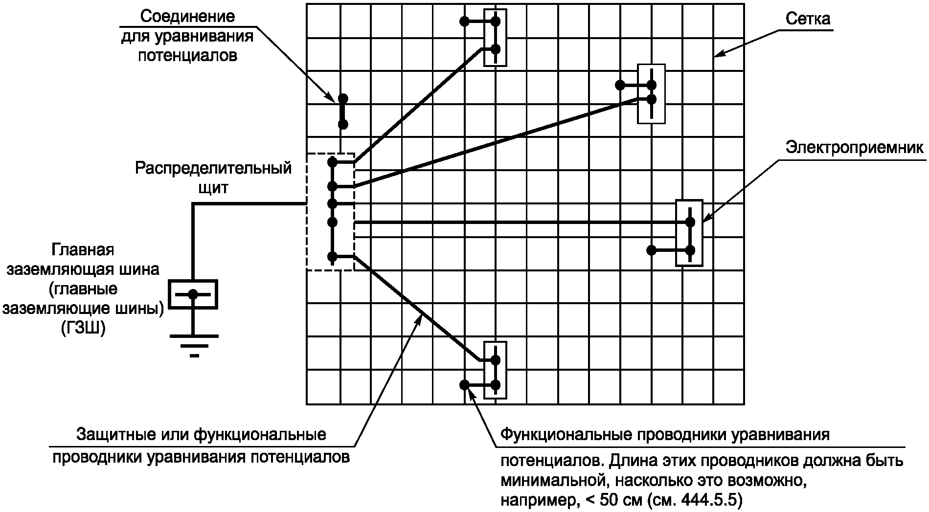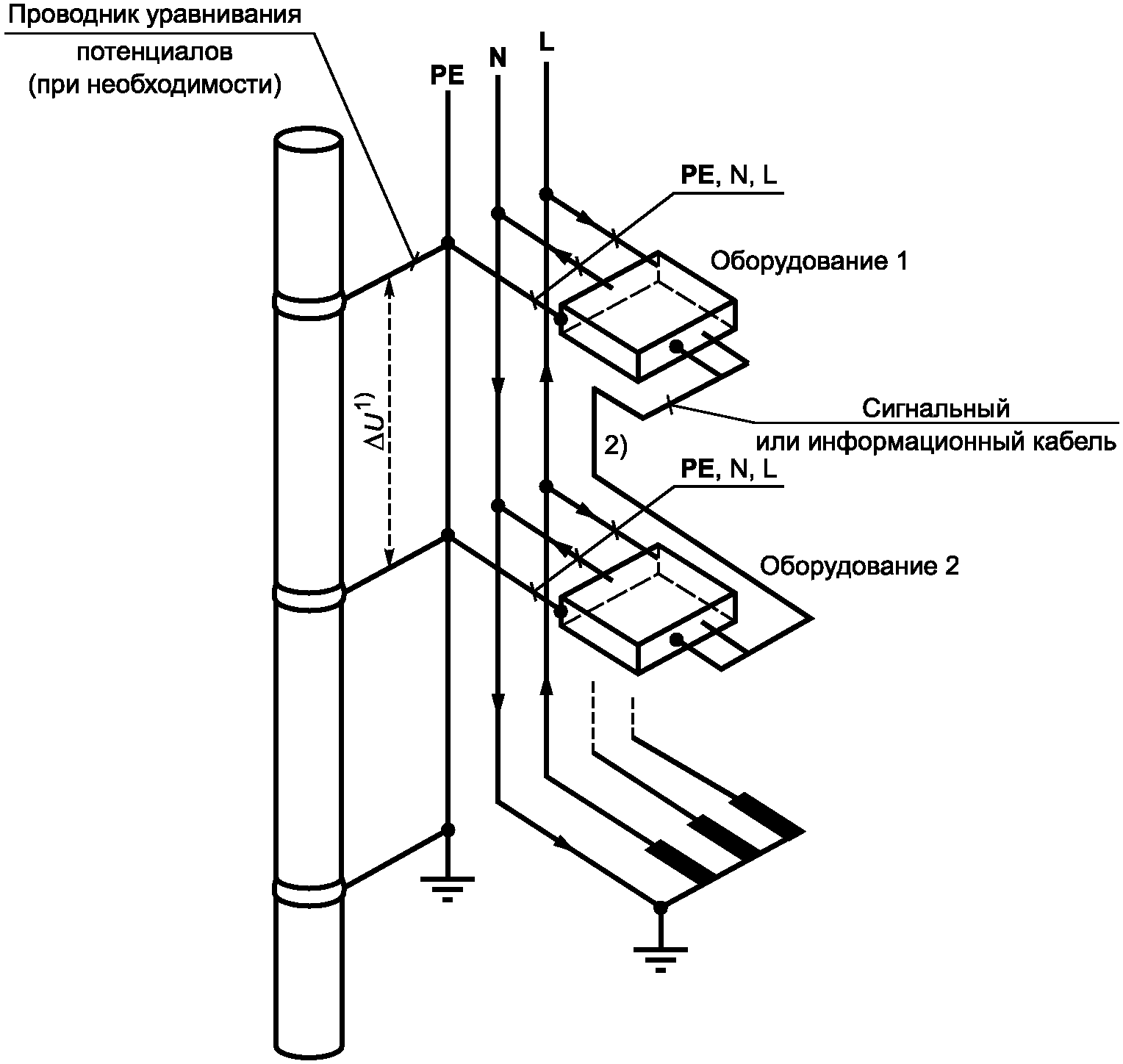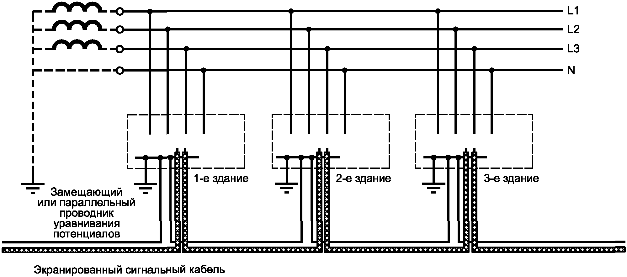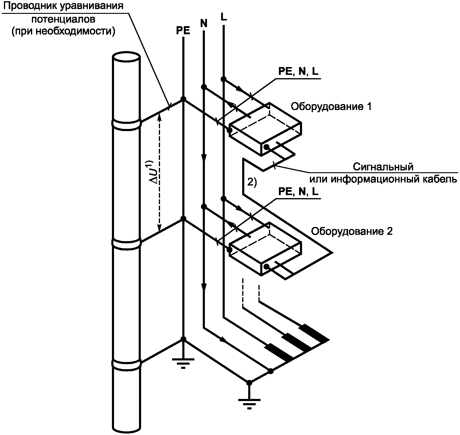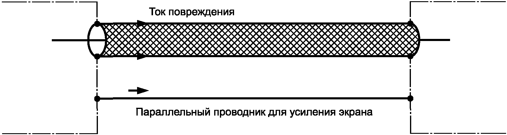 Если оборудование, присоединенное неэкранированными кабелями, не подвергается воздействию низкочастотных возмущений, защитные свойства неметаллической системы электропроводки улучшаются прокладкой внутри нее одиночного проводника, используемого в качестве шунтирующего проводника уравнивания потенциалов. Этот проводник должен быть надежно присоединен к системе заземления, к которой присоединено оборудование на обоих концах проводника, например, посредством присоединения к металлической оболочке шкафа.