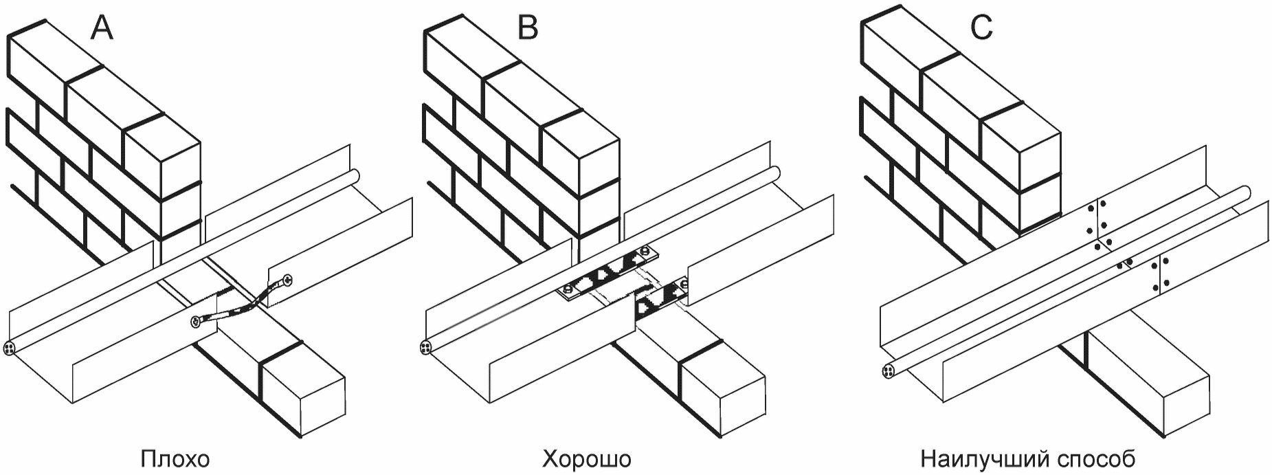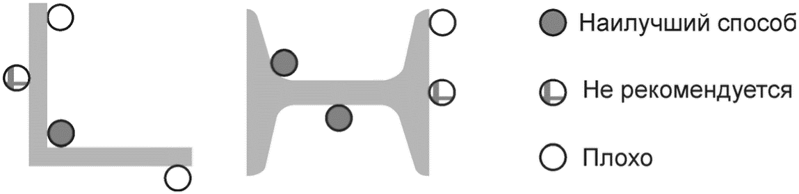 Металлические конструктивные элементы зданий могут успешно служить целям электромагнитной совместимости. Стальные балки L-, H-, U- или T-образного профилей часто представляют собой непрерывные заземленные конструкции с мощным поперечным сечением, с большой площадью поверхности и с множественными промежуточными соединениями с землей. Прокладка кабелей по таким балкам является предпочтительной. Предпочтительна прокладка внутри углов, а не по внешней поверхности (см. рисунок 44.R21).