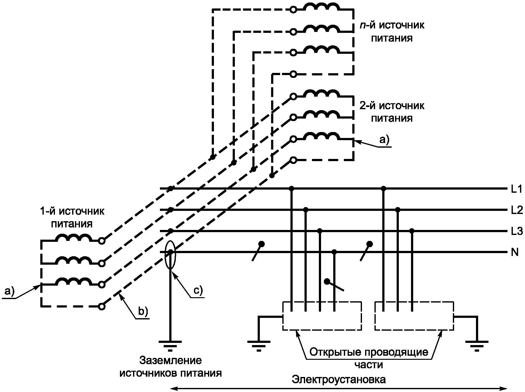 c) в распределительной сети, питающей электрические установки, соответствующие типам заземления системы TN, в которых применена мера защиты "автоматическое отключение питания", защитные заземляющие проводники устройств защиты от импульсных перенапряжений, соединенных с линейными проводниками, присоединяются к PEN-проводнику или к защитному проводнику PE;