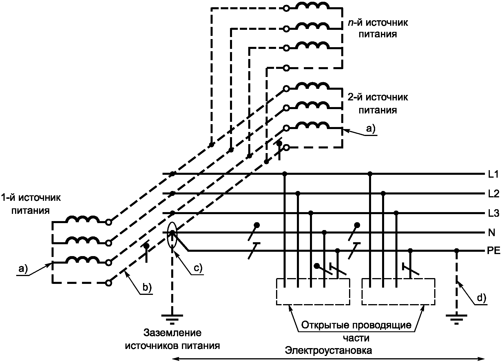 d) в распределительной сети, питающей электрические установки, соответствующие типу заземления системы TT, в которых применена мера защиты "автоматическое отключение питания", устройства защиты от импульсных перенапряжений должны быть предусмотрены для линейных проводников и для нейтрального проводника N. В месте, где нейтральный проводник N распределительной сети эффективно заземлен, установка устройства защиты от импульсных перенапряжений для нейтрального проводника N не требуется.