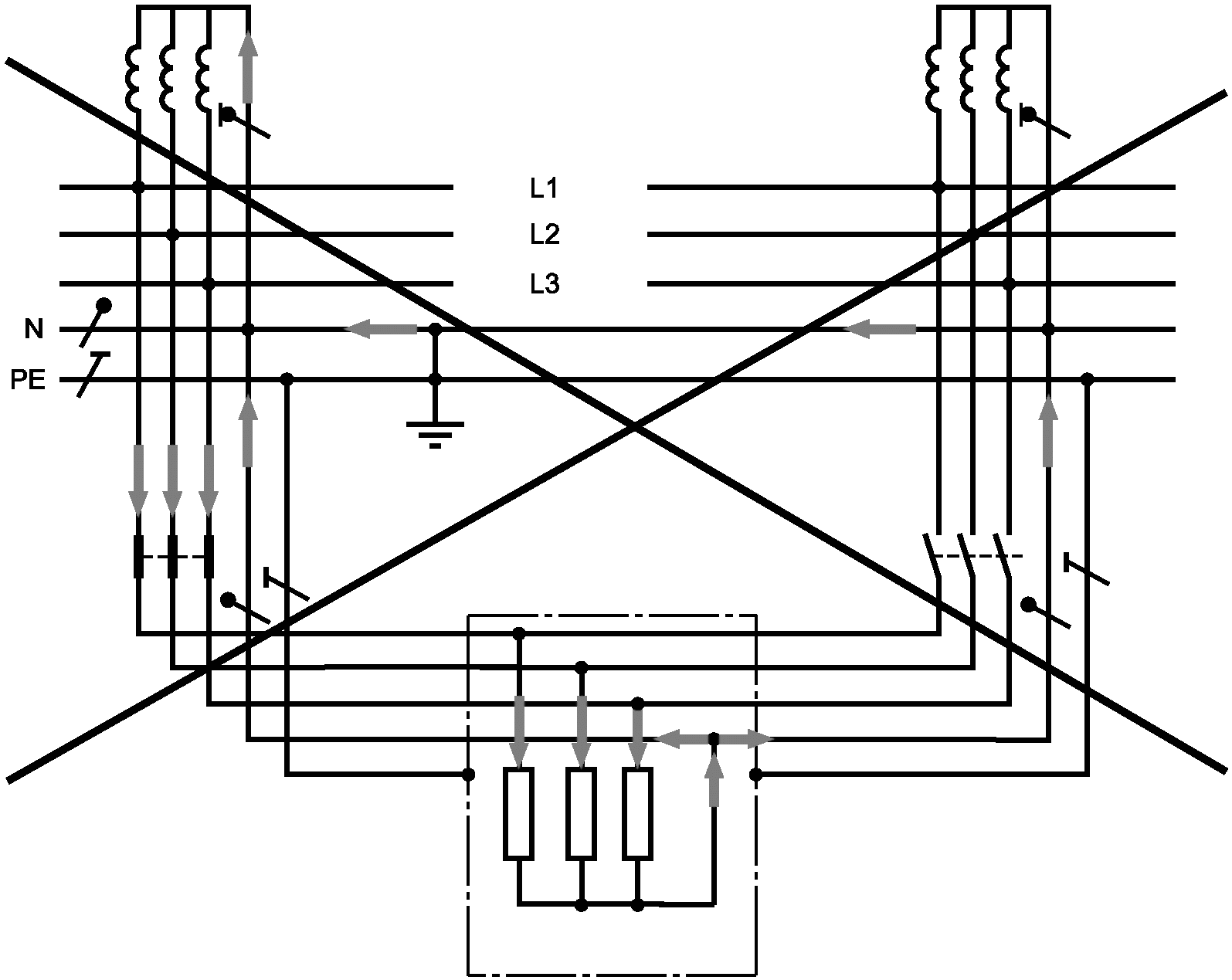 - обрыв нейтрального проводника N в низковольтной системе (см.