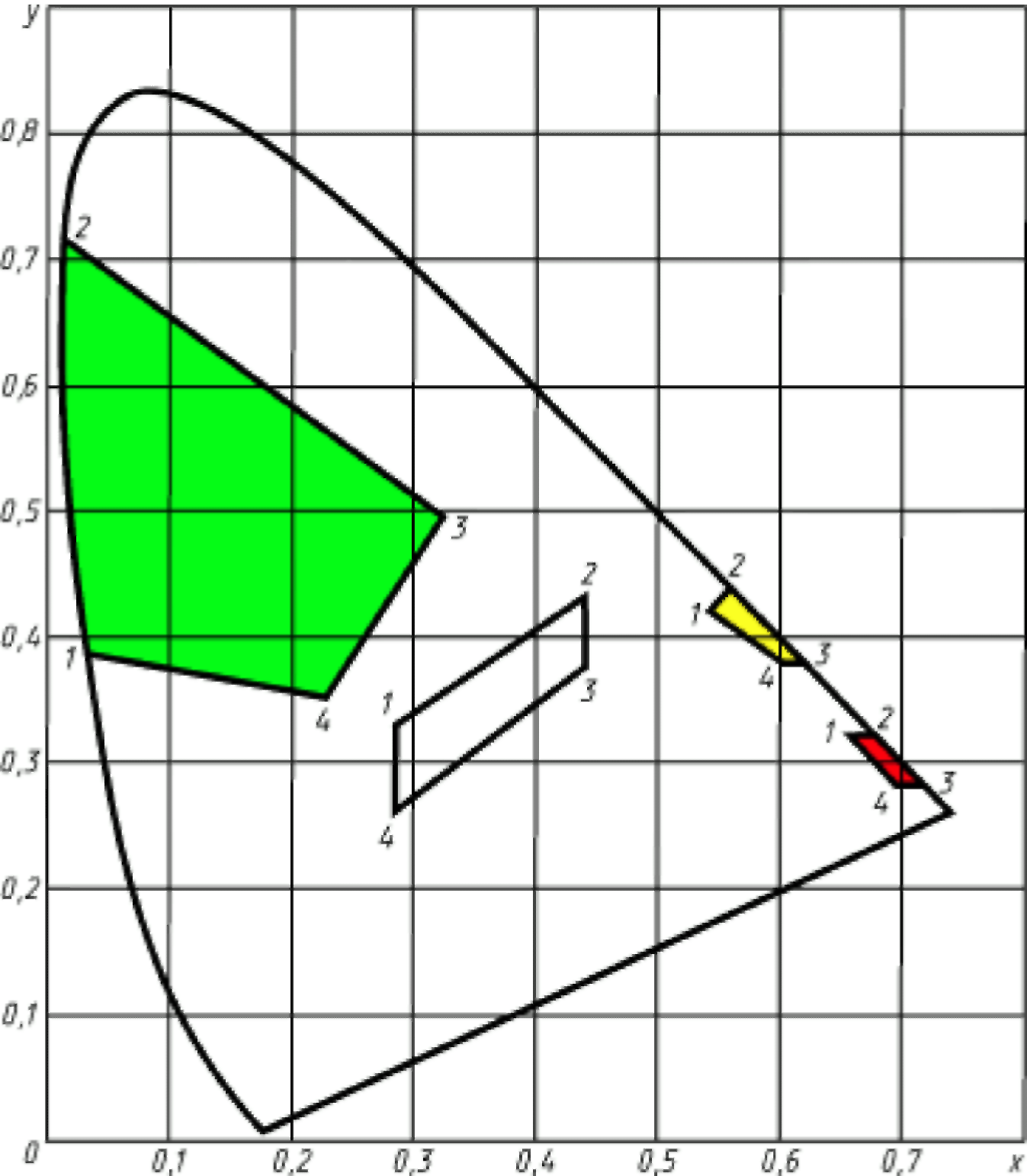 Цвет сигнала | Обозначение координат | Координата цветности угловых точек цветовых областей |