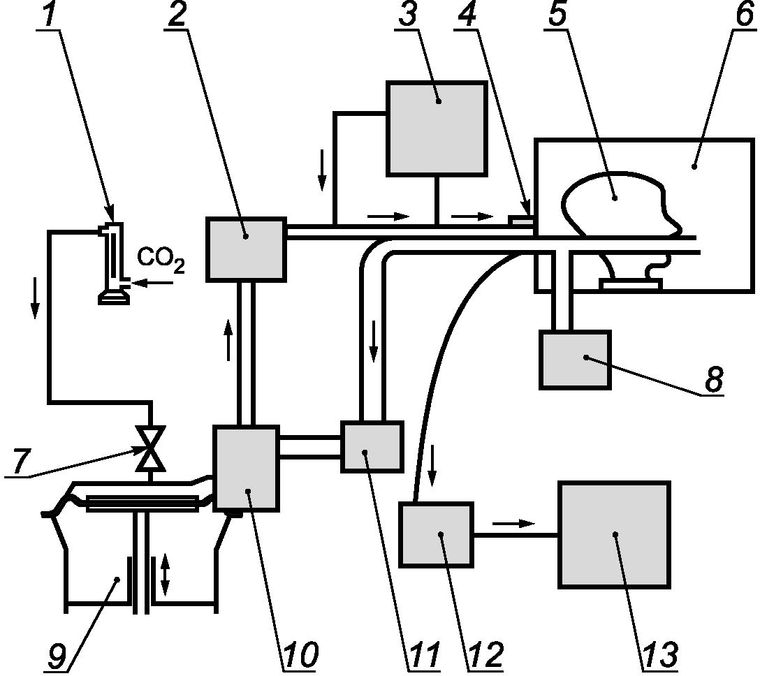 3 - анализатор диоксида углерода; 4 - датчики температуры