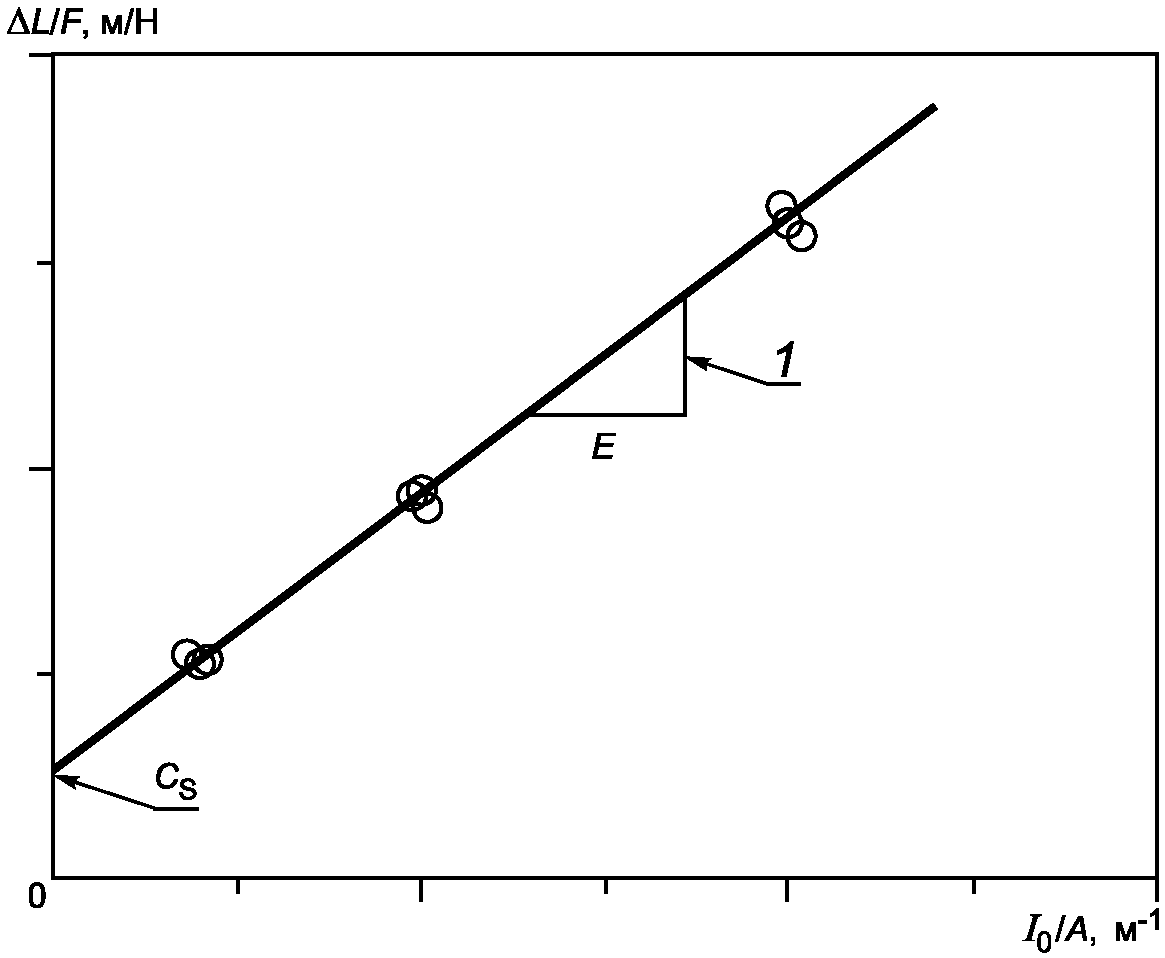 По наклону линейной области графика зависимости "нагрузка-деформация" определяют модуль упругости при растяжении для волокна. Если прямое измерение деформации не проводилось, модуль Юнга для волокна можно определить с помощью процедуры расчета податливости системы в соответствии с