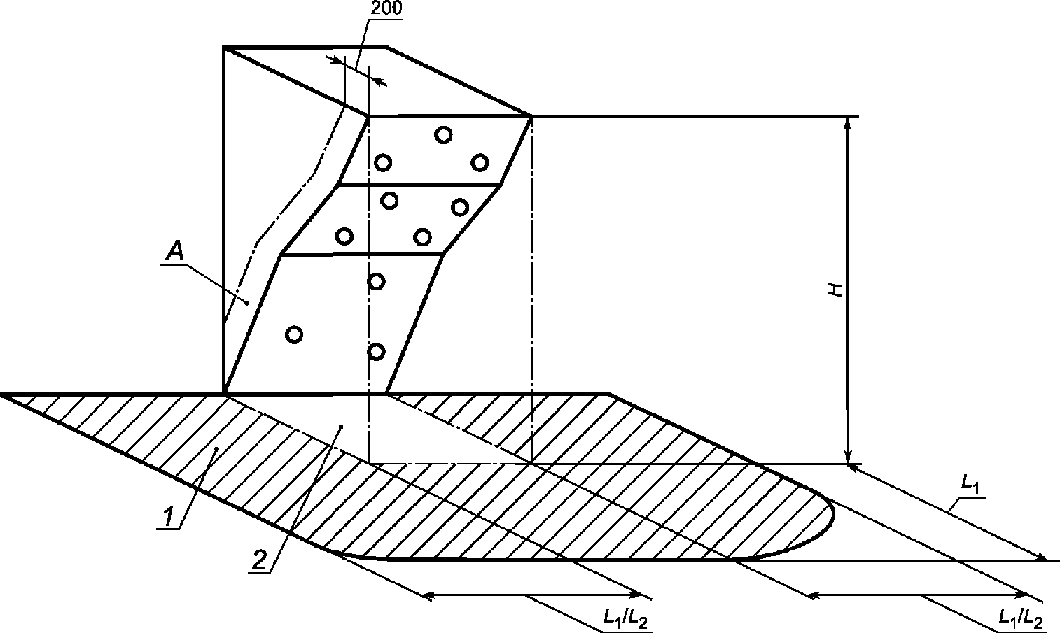 - если высота стены для боулдеринга менее или равна 3 м, область удара у основания стены для боулдеринга следует расширить на величину L1 >= 2 м от проекции стены;