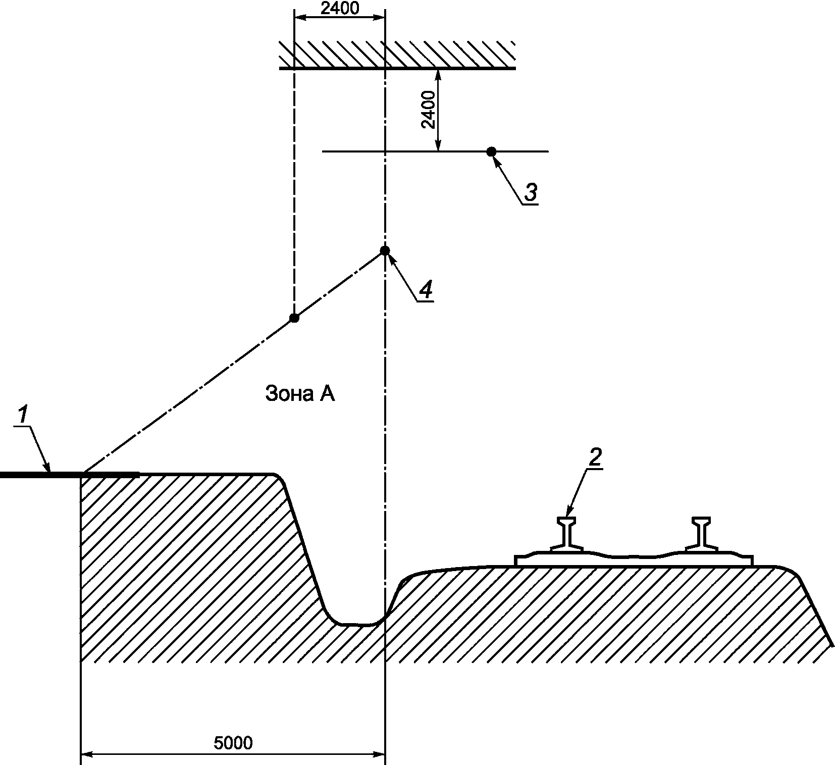 К сооружениям или их отдельным конструкциям, на которые возможно попадание напряжения вследствие соприкосновения с проводами системы тягового электроснабжения, относятся сооружения или конструкции, полностью или частично расположенные в зоне А, показанной на