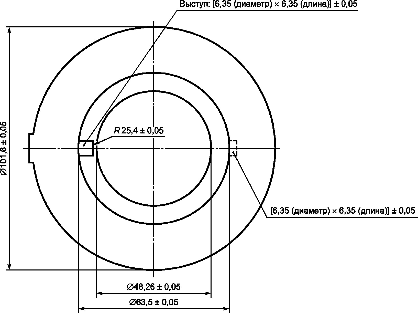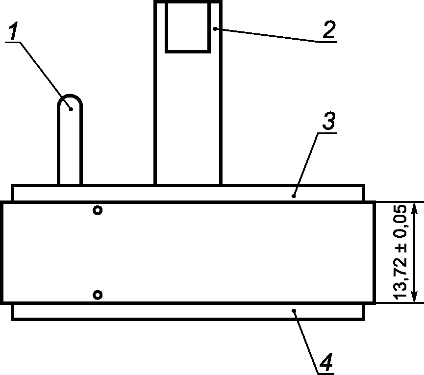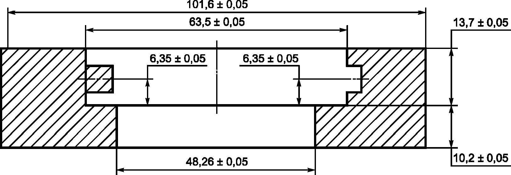 4.1.3 Кольцо устройства для растрескивания битумного вяжущего должно быть изготовлено из инвара и иметь следующие размеры: внешний диаметр (50,80 +/- 0,05) мм, высота (13,72 +/- 0,05) мм, толщина (1,65 +/- 0,05) мм. На внутренней поверхности кольца должны быть расположены термодатчик и тензодатчик. Допускается прикрепление к кольцу защитных крышек (верхней и нижней) с помощью штифтов, расположенных с шагом 120° по окружности кольца. В том случае, если используют защитные крышки, на верхней крышке должен быть установлен индикатор положения тензодатчика, как показано на рисунках 1 и