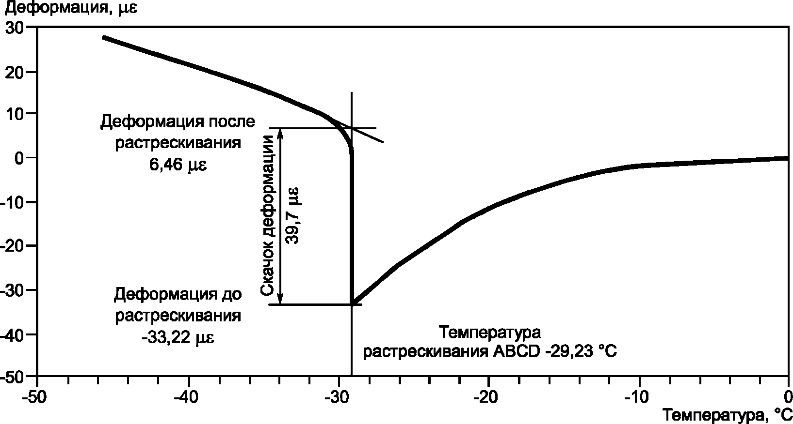 10.1 Температуру растрескивания ABCD битумного вяжущего необходимо определять в момент скачка деформации в испытуемом образце по графику зависимости деформации от температуры, представленному на рисунке 7.