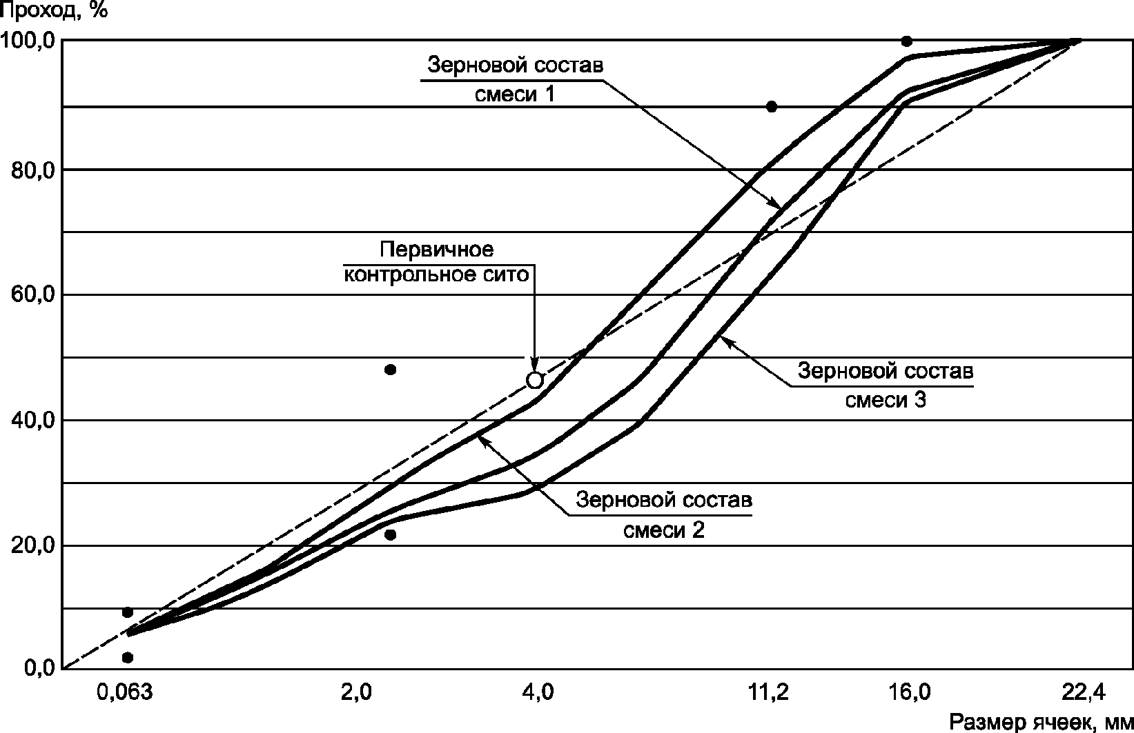 4.2.2 Для выбора оптимального зернового состава на применяемых материалах готовят не менее трех различных составов минеральной части асфальтобетонной смеси одного типа. Графический пример подготовки трех различных составов смеси приведен в