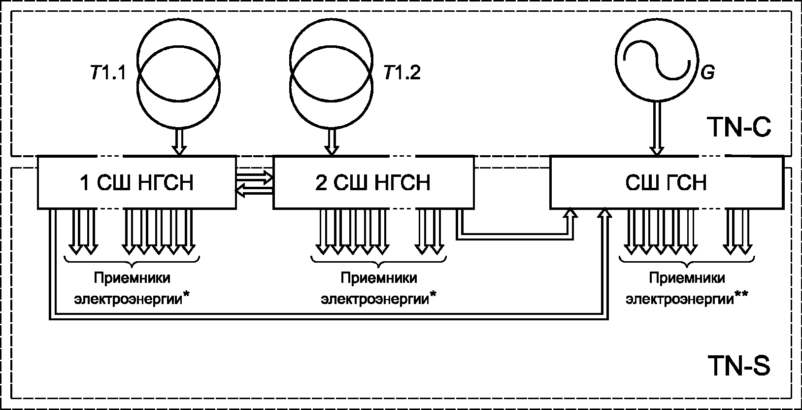 - для тяговой или трансформаторной подстанции с двумя основными трансформаторами собственных нужд, дизель-генераторным агрегатом и системой токоведущих проводников и заземления TN-C-S без резервного трансформатора собственных нужд (см.