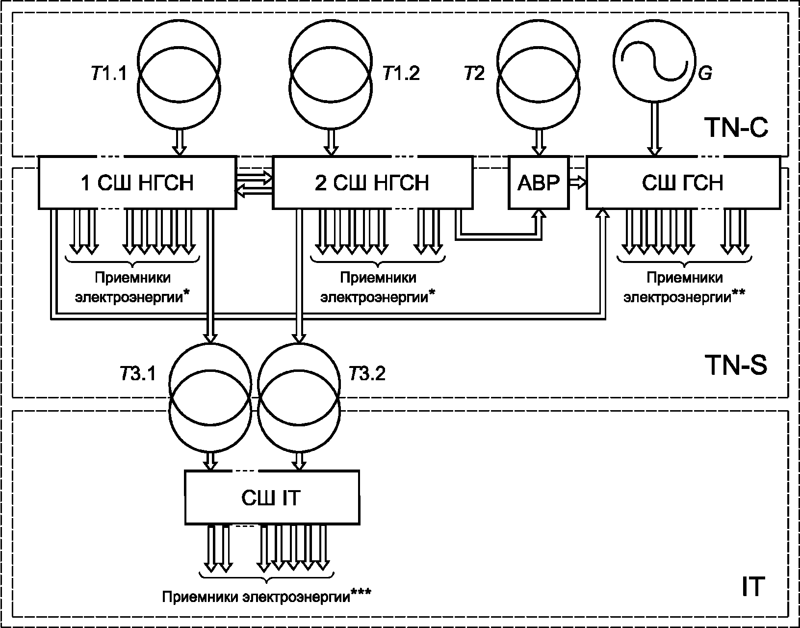 - для тяговой или трансформаторной подстанции с двумя основными и одним резервным трансформаторами собственных нужд, дизель-генераторным агрегатом и системой токоведущих проводников и заземления TN-C-S (см.