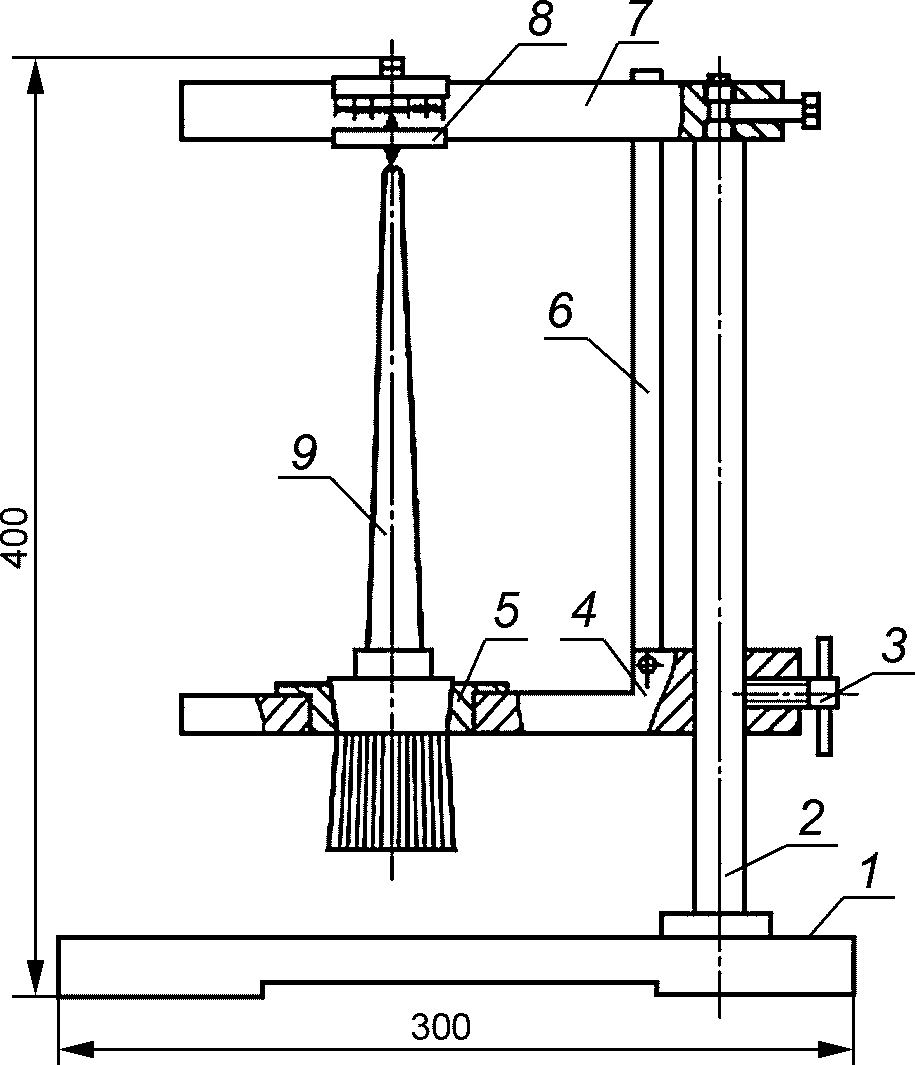 Испытания проводят в следующей последовательности: пучок кисти или щетки диаметром 5 мм, выбранный в периферийной части кисти, вставляют в отверстие патрона и при помощи подвижного конуса закрепляют в нем. После этого кисть или щетку с указанным приспособлением устанавливают на разрывную машину, закрепляя в ней ручку кисти и приспособление, или используют динамометр и снимают показатели на машине или динамометре.