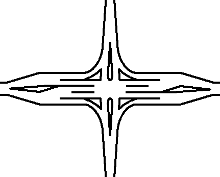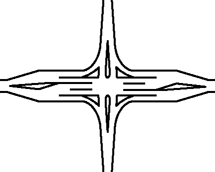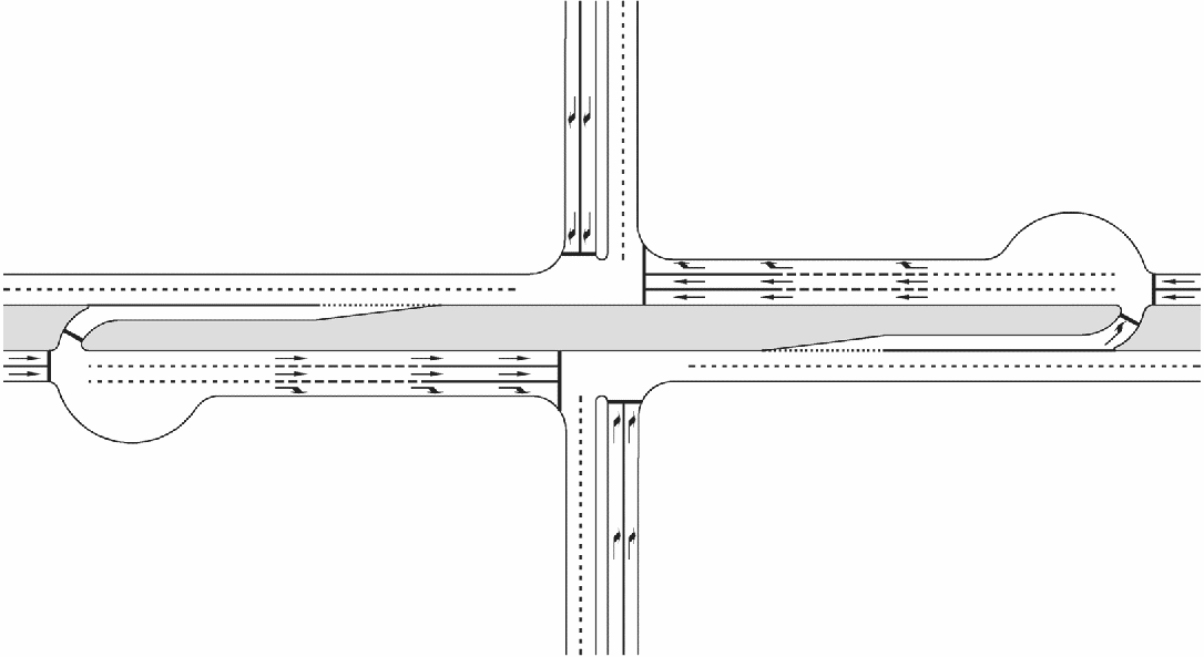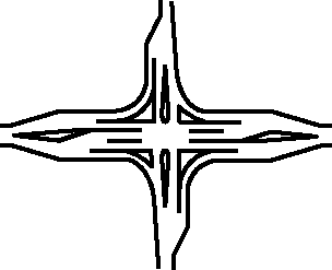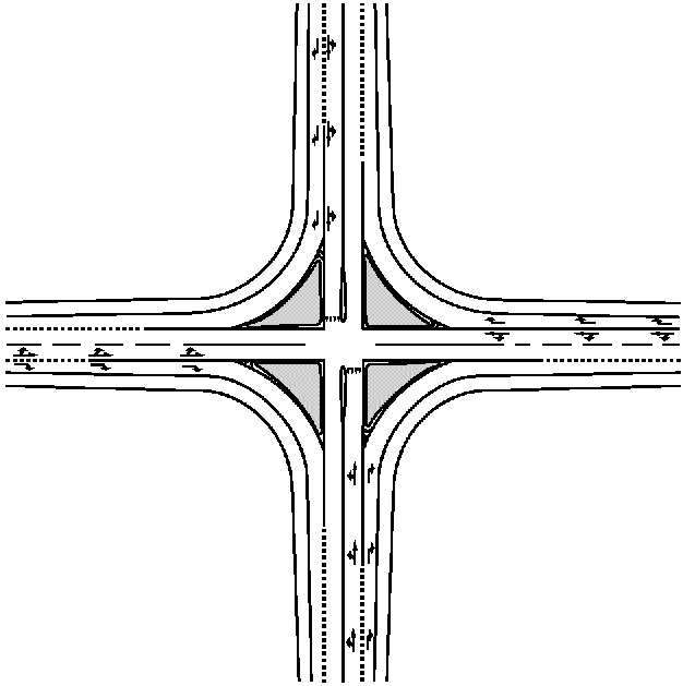 3.4 канализированное пересечение: Пересечение или примыкание в одном уровне с выделенными с помощью разделительных островков полосами для различных направлений движения транспортных потоков.