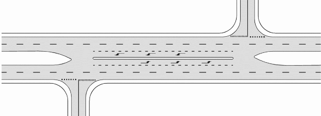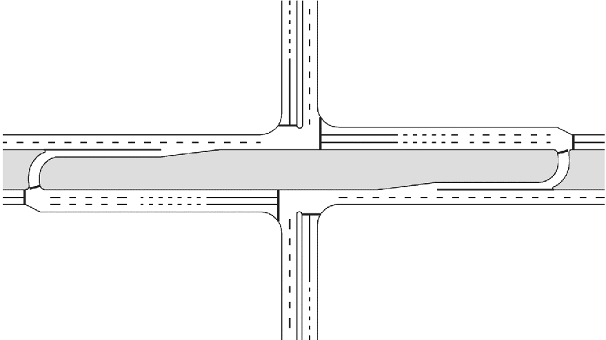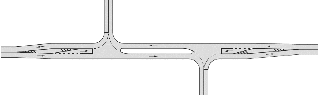3.17 частично канализированное пересечение: Пересечение или примыкание в одном уровне с выделенными с помощью разделительных островков полосами для части из осуществляемых направлений движения транспортных потоков.