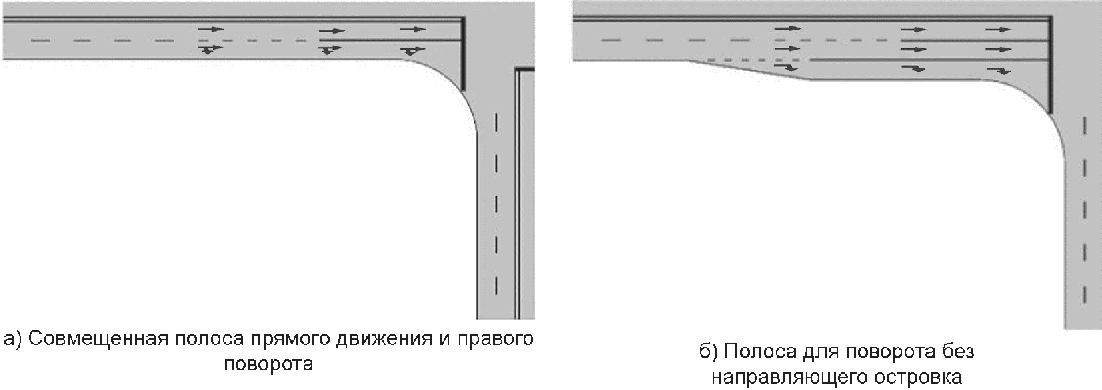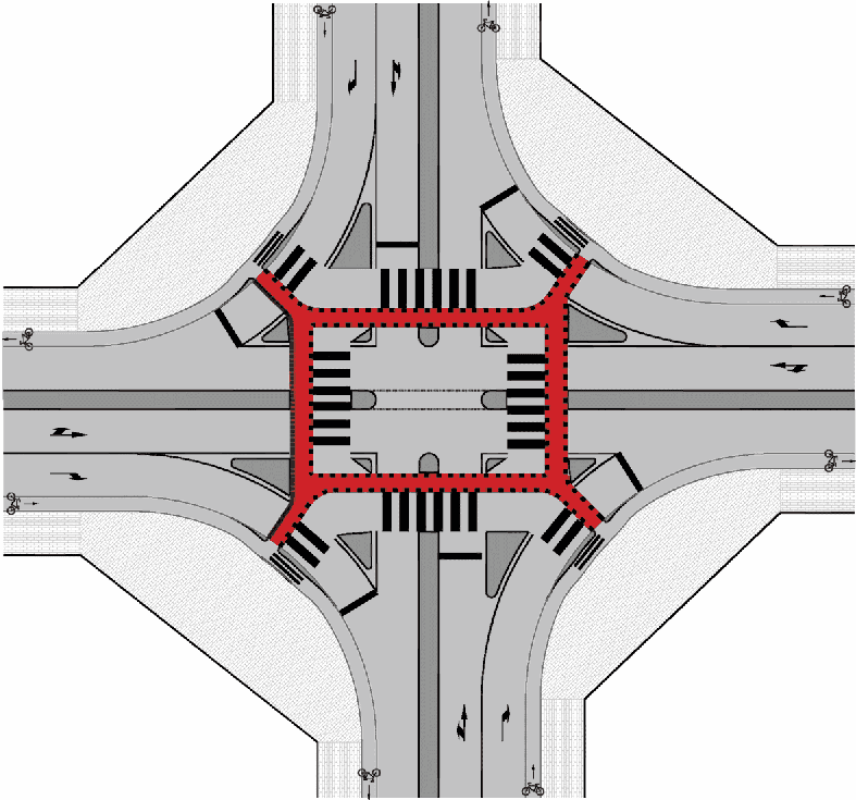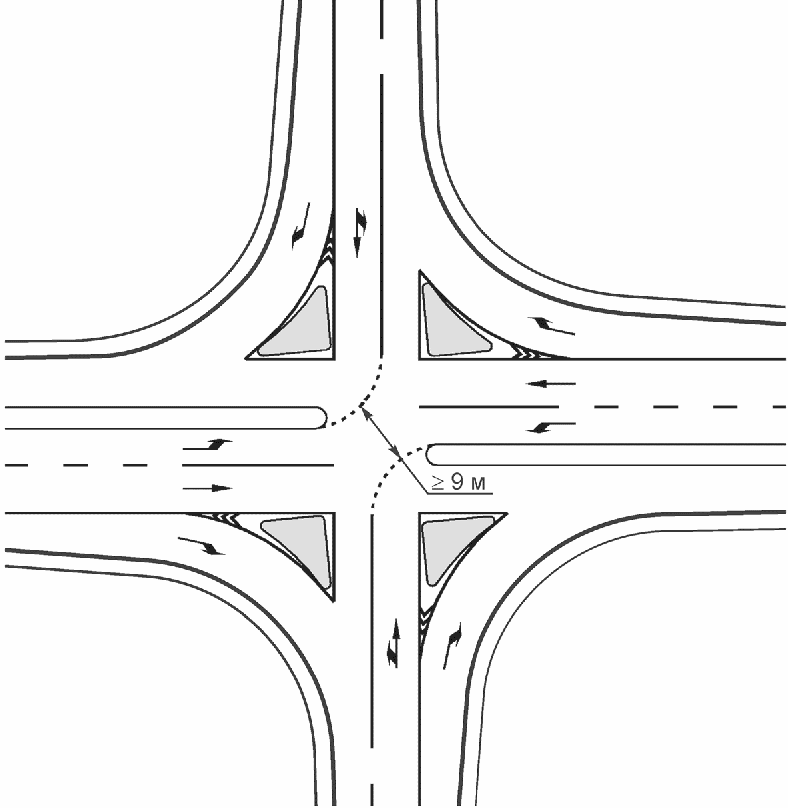 - минимизацию площади пересечения и времени, требуемого для освобождения автомобилями участка конфликта пересечения или примыкания;