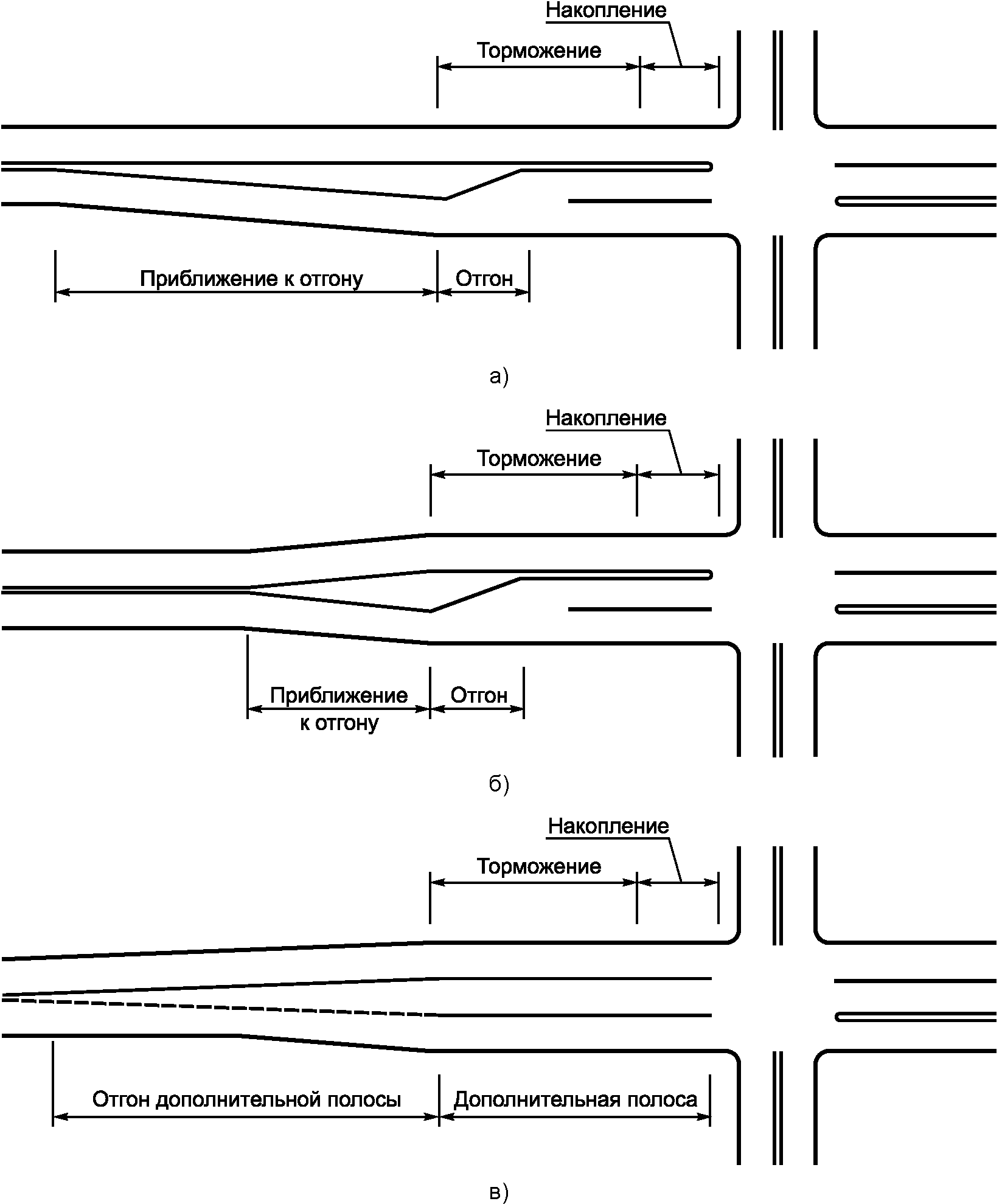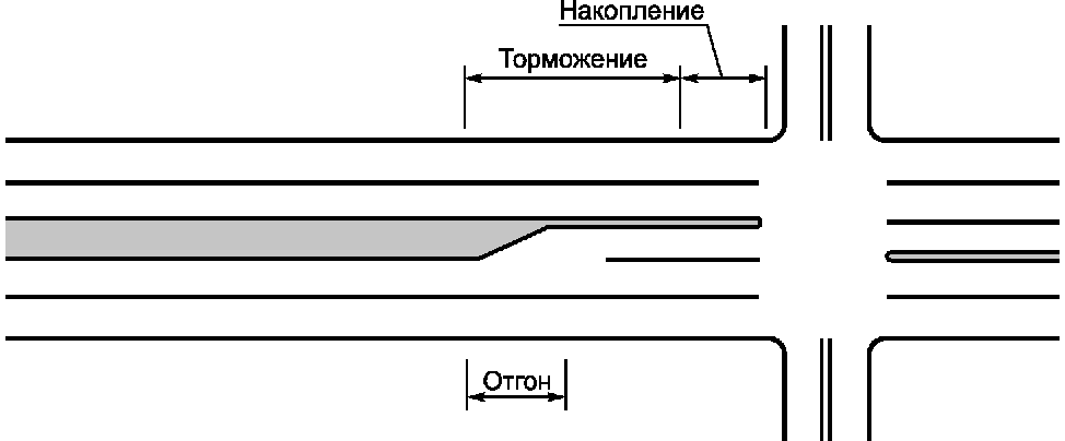 3.10 полоса торможения: Переходно-скоростная полоса, служащая для снижения скорости перед пересечением или примыканием выходящими из основного потока автомобилям без помех основному движению.