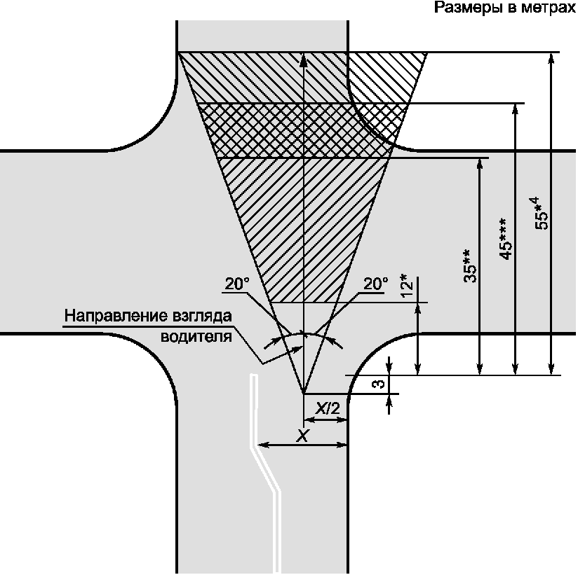 (рисунок Д.1). Расположение водителя принимается на центре проезжей части (при числе полос движения не более двух) или каждой полосы движения соответствующего направления, на расстоянии 3 м до стоп-линии.