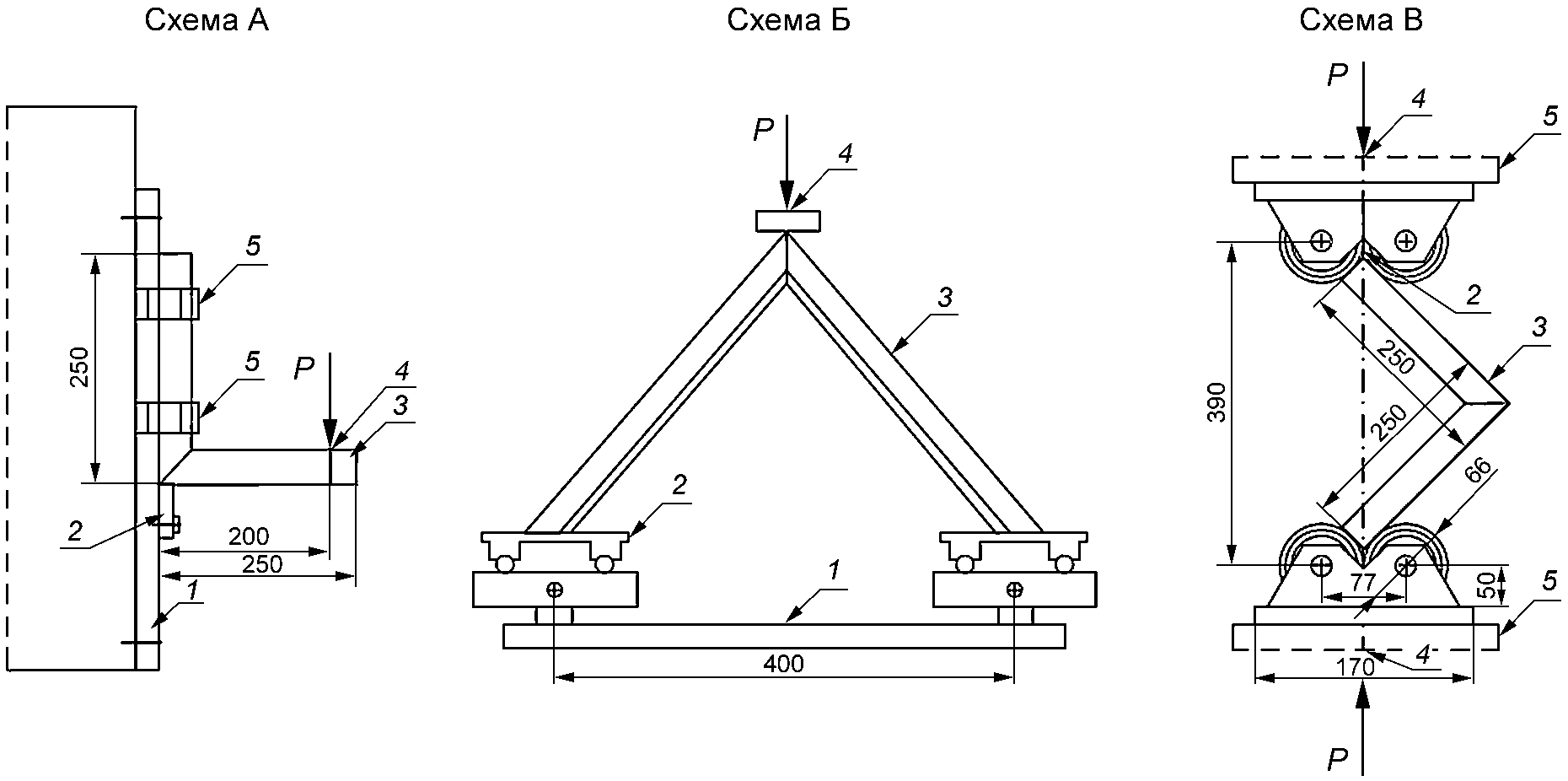 При испытаниях по схеме А образец одной из сторон жестко закрепляют к вертикальной или горизонтальной опоре. К другой стороне в плоскости образца прикладывают нагрузку (например, при помощи винтового приспособления). Значение нагрузки измеряют динамометром. При вертикальном расположении образца допускается создавать нагрузку путем навешивания свободного груза на горизонтальную сторону образца вручную на тросе или проволоке. Образцы выдерживают под нагрузкой не менее 3 мин.