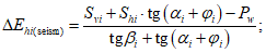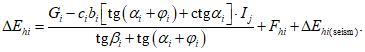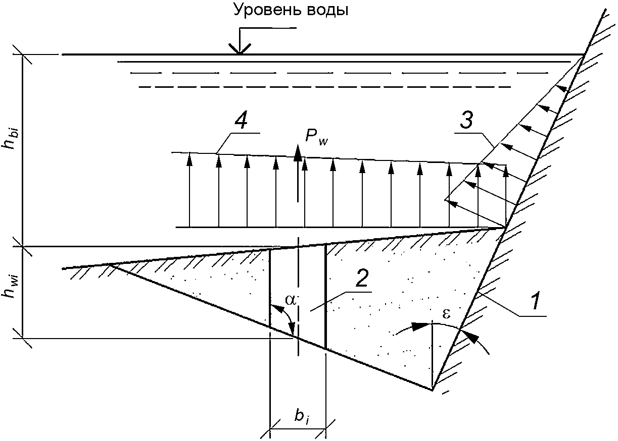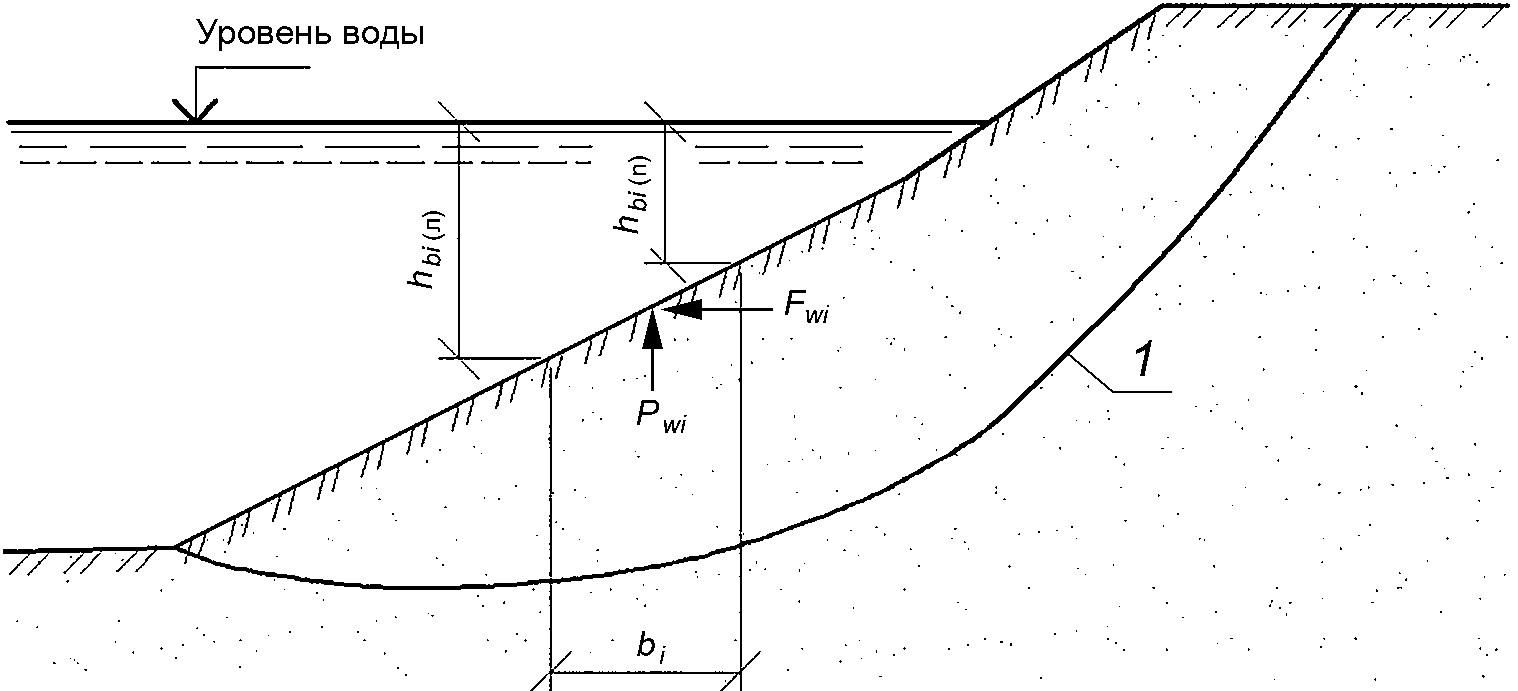 где hi(л) и hi(п) - глубины воды над плоскостью скольжения у верховой и низовой границ элемента, но не более, чем глубина воды над водоупором (если поверхность скольжения проходит через водоупор);