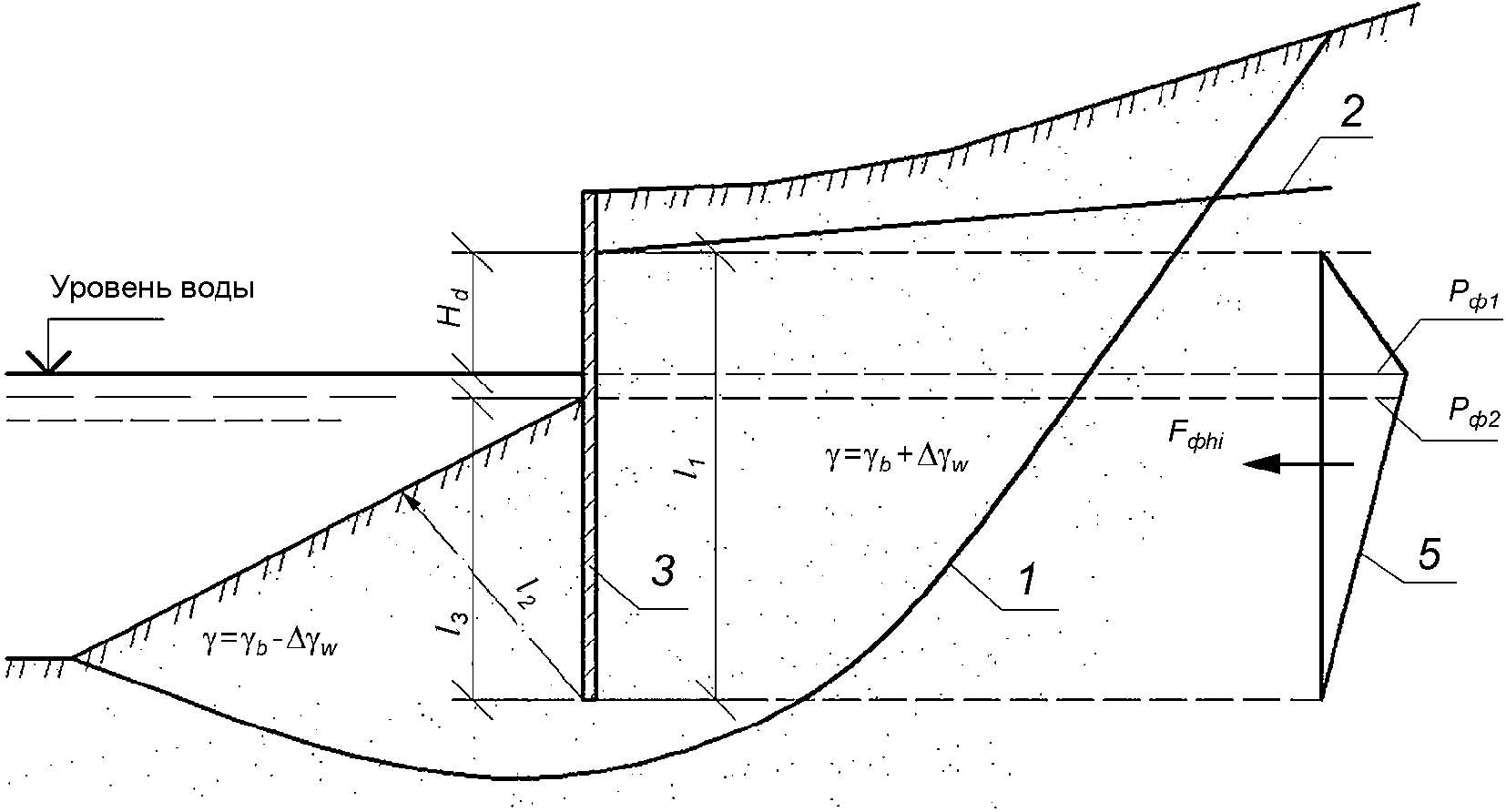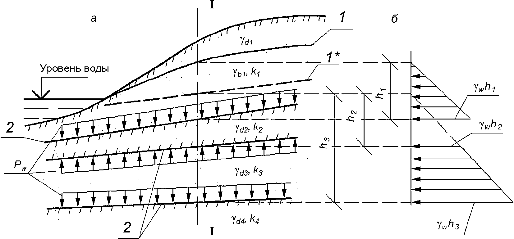 При этом площадь эпюр следует увеличивать на 30% при суточных колебаниях уровня воды и на 10% - при сезонных (для учета влияния подъема кривой депрессии в сдвигаемом массиве грунта).