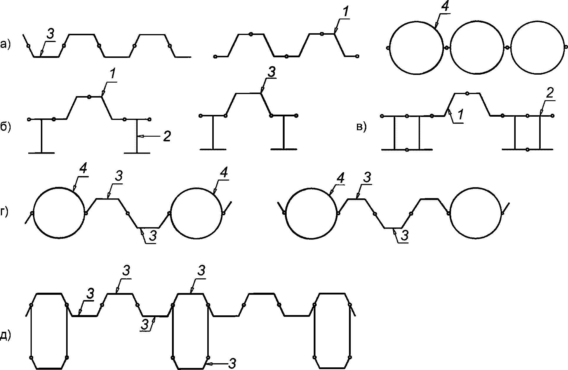 2 В настоящее время для шпунтовых стен используются разные типы металлических и пластиковых шпунтовых свай, причем в различных сочетаниях, как показано на