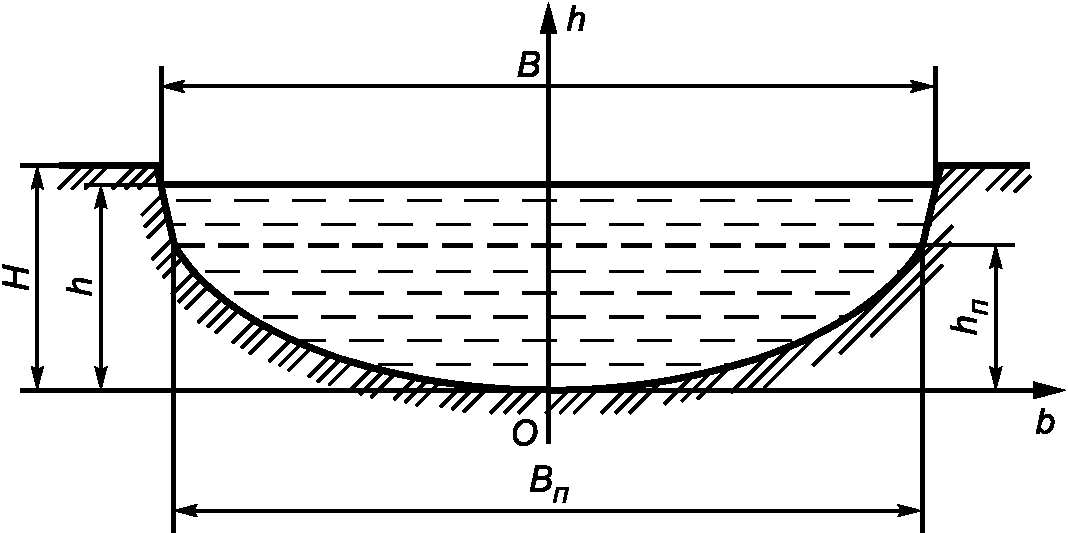 Примечание - h - глубина воды в канале, м; hп - глубина параболической части канала, м; Bп - ширина поверху параболической части канала, м; p - параметр параболы; m - заложение откосов трапецеидальной части канала. |