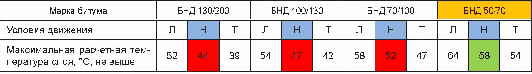 Для нормальных условий движения это все марки из графы условий движения "нормальные (Н)" с максимальной расчетной температурой слоя не ниже 47,2 °C (то есть 52 °C и 58 °C), таким образом, для слоя основания возможно применение марок БНД 50/70 и БНД 70/100.