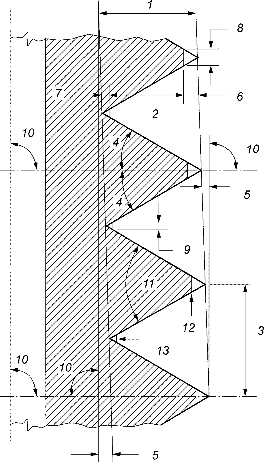 Угол между сторонами резьбы, измеренный в осевом направлении, должен равняться 60°. Линия деления этого угла пополам расположена перпендикулярно оси.