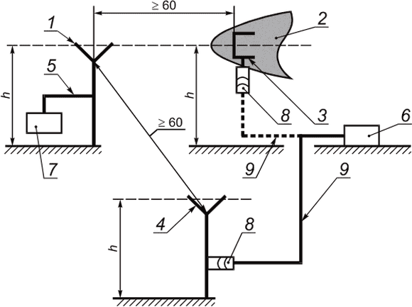 - необходимо, чтобы облучающая антенна устанавливалась на той же высоте, что и измеряемая антенна, установленная на макете фрагмента ВС, расстояние между ними должно быть не менее 60 м.