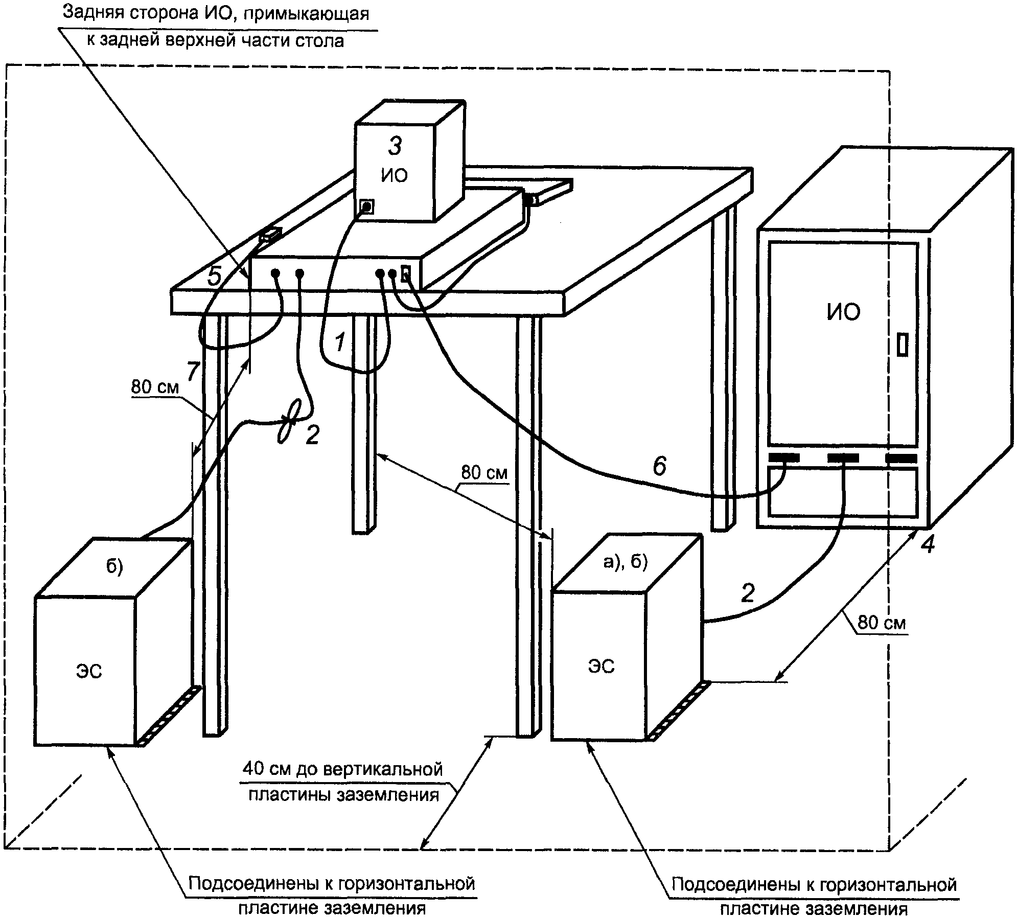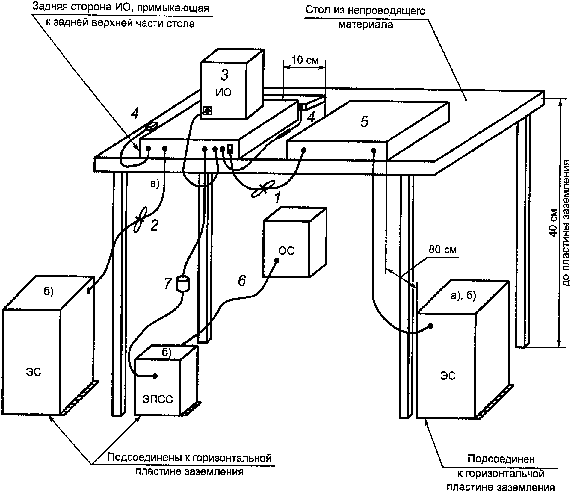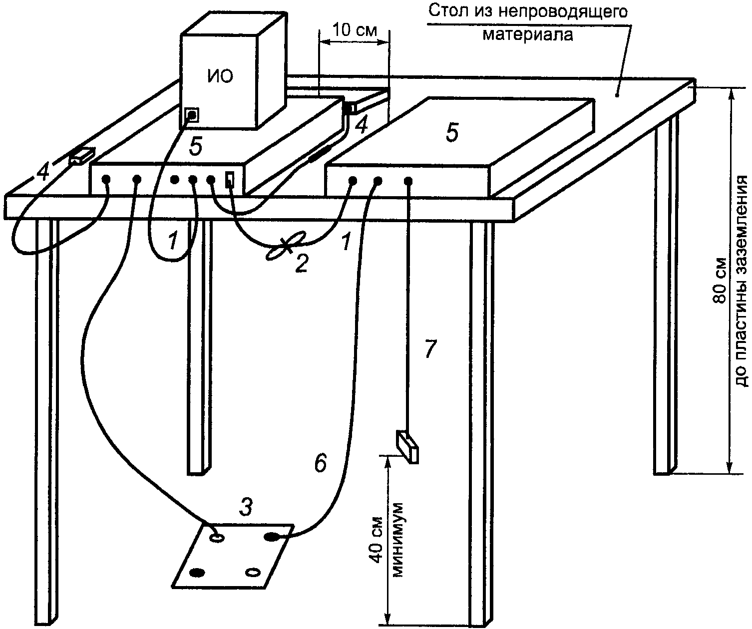 6.4.3. Настольное ИО располагают на столе из неметаллического материала высотой 80 см над горизонтальной пластиной заземления измерительной площадки. Напольное ИО размещают непосредственно на пластине заземления, при этом оборудование должно быть отделено от пластины заземления изоляционной прокладкой толщиной 15 мм.
