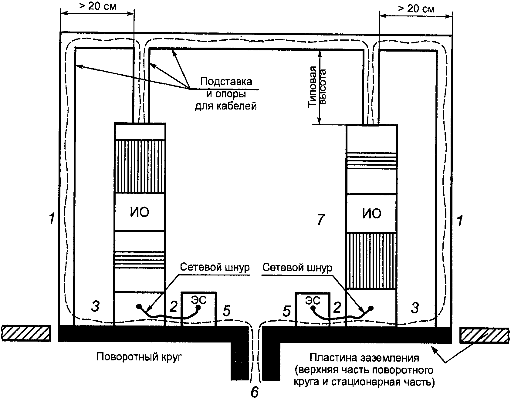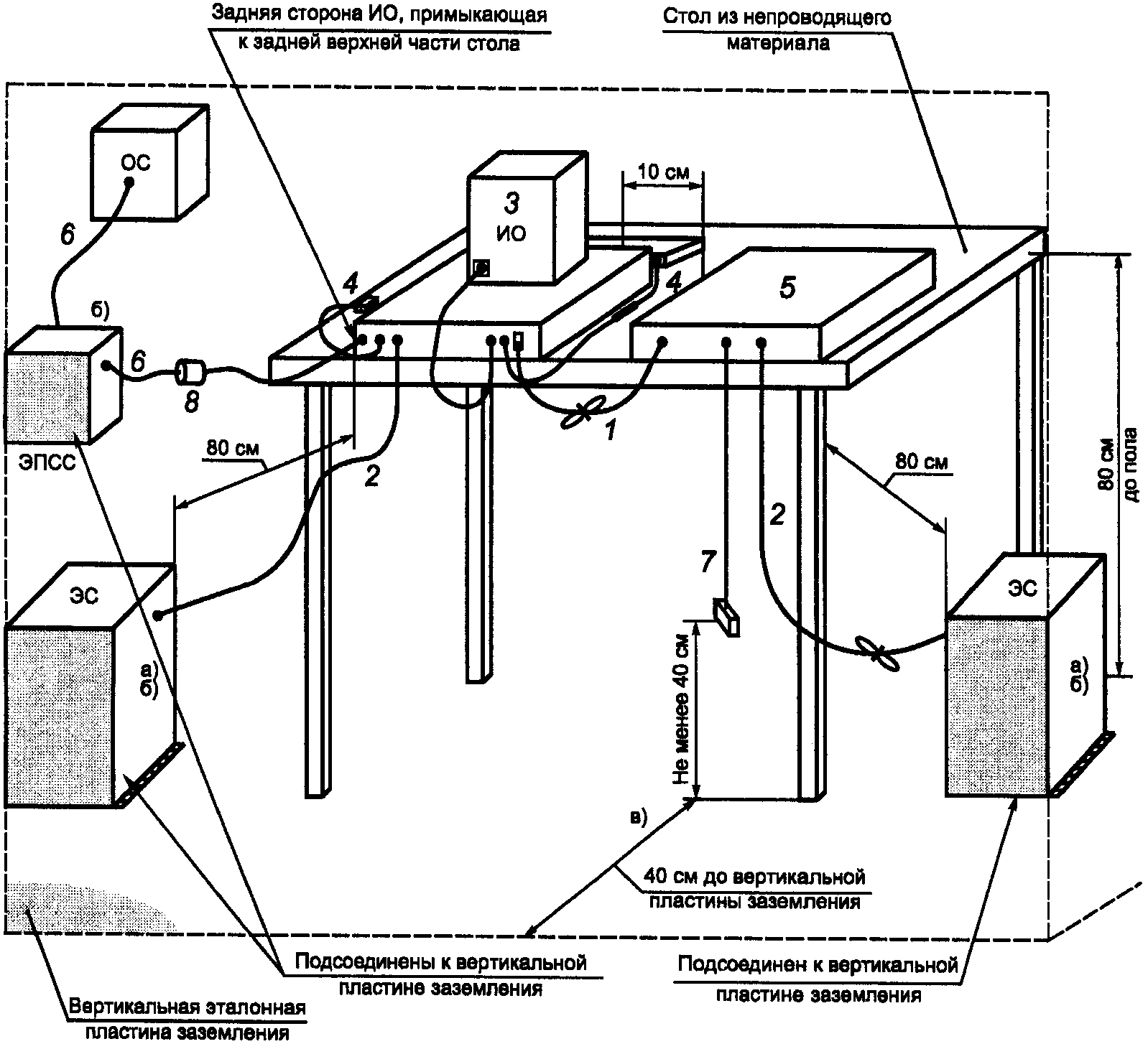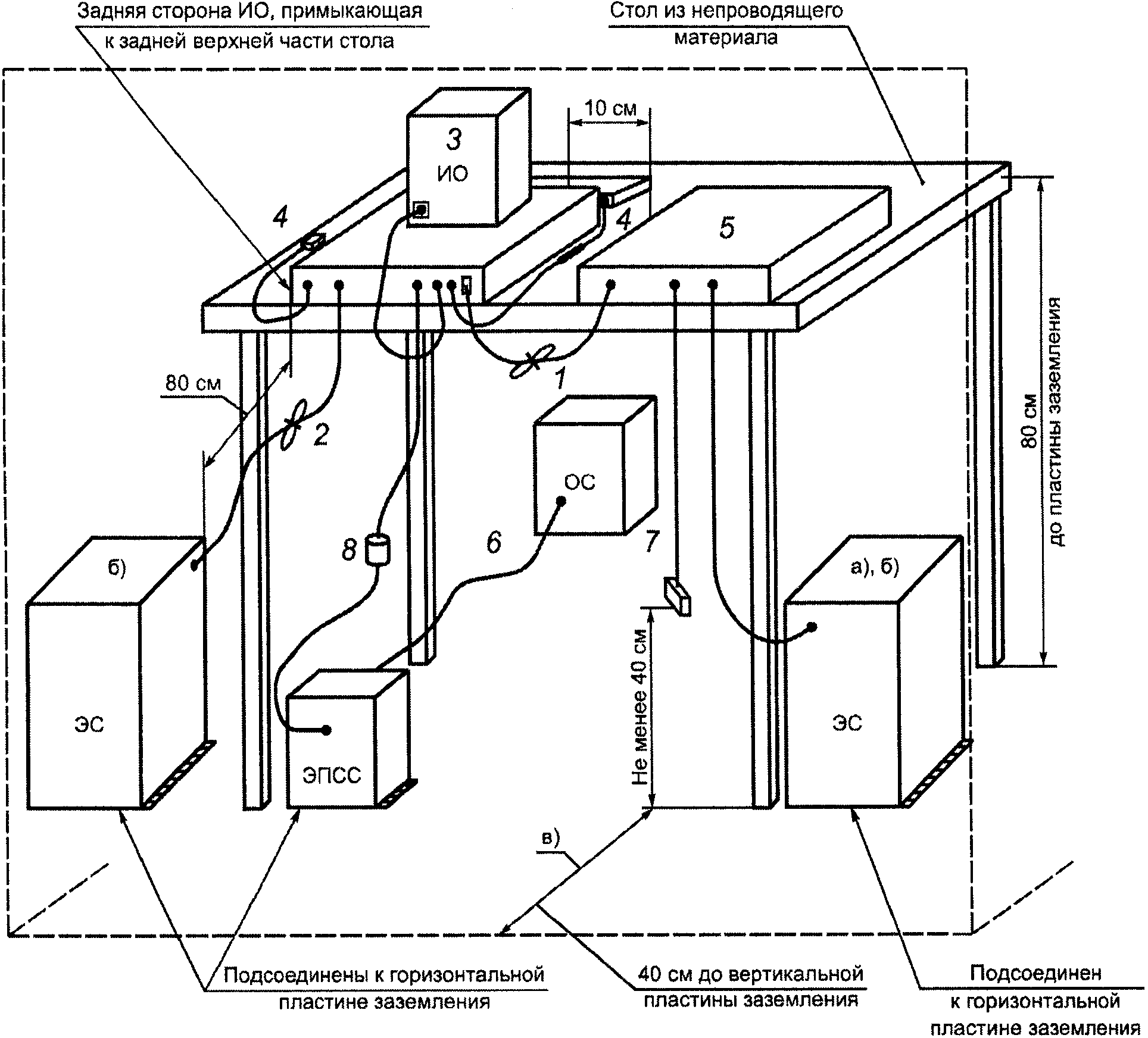 6.4.3. Настольное ИО располагают на столе из неметаллического материала высотой 80 см над горизонтальной пластиной заземления измерительной площадки. Напольное ИО размещают непосредственно на пластине заземления, при этом оборудование должно быть отделено от пластины заземления изоляционной прокладкой толщиной 15 мм.