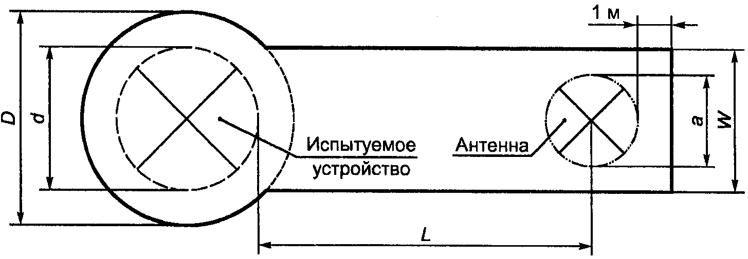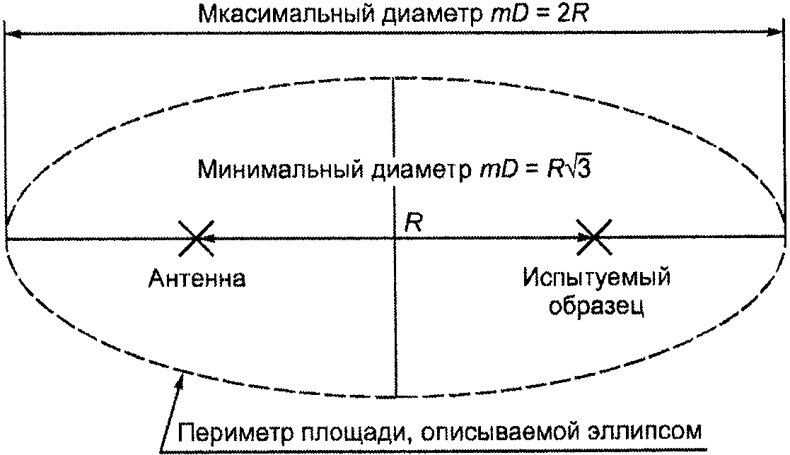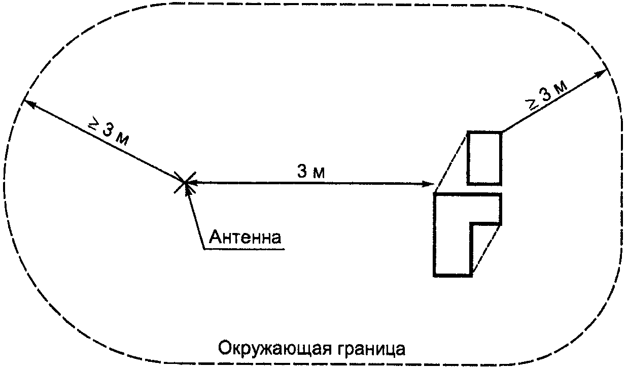 Примечание. Внутри объема, ограниченного на поверхности земли линией, указанной на рисунке, а по высоте - горизонтальной плоскостью, расположенной на высоте не менее 3 м над самым высоким элементом измерительной антенны или ИО, не должно быть отражающего объекта.