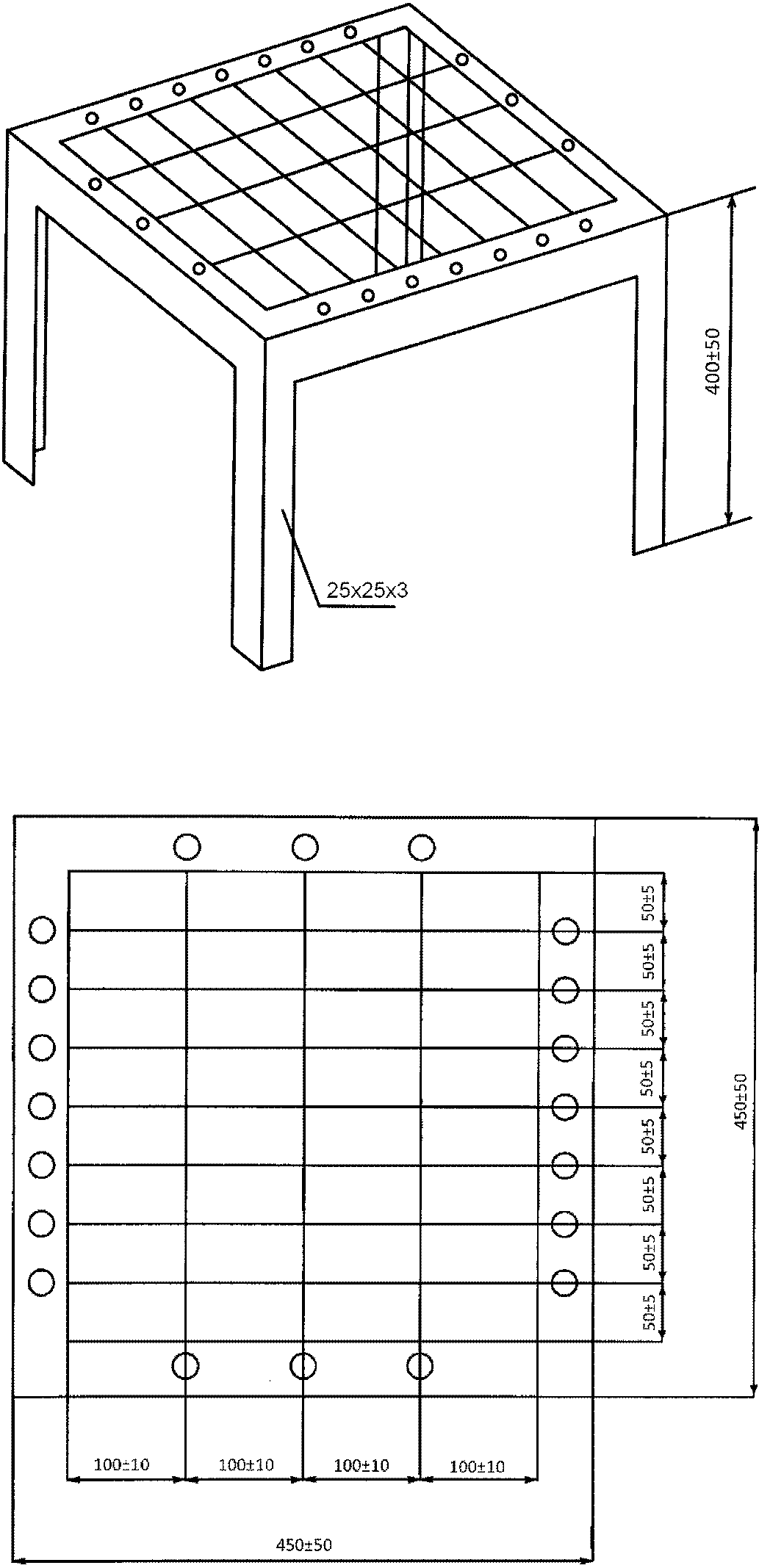 Испытательный стенд представляет собой станину, изготовленную из металлических уголков размером 25 x 25 x 3 мм. Размеры станины: высота (400 +/- 50) мм, длина и ширина (400 +/- 50) мм. На станине размещена проволочная сетка. На сетку уложена минераловолокнистая плита (подложка) размерами (450 +/- 50) x (450 +/- 50) мм. Толщина плиты должна составлять от 20 до 30 мм, а ее плотность - от 80 до 200 кг·м-3.