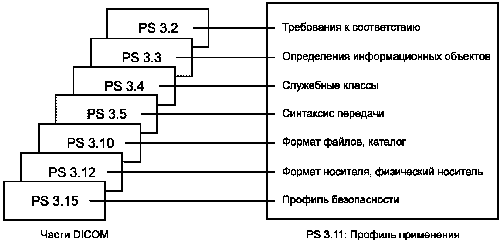 рисунок 3). Назначением данной части является обеспечение основ для обмена медицинскими изображениями различных типов и сопутствующей информацией с использованием широкого спектра физических носителей информации.
