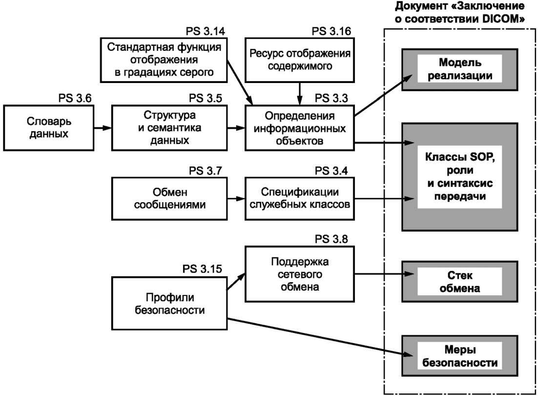 Заключение о соответствии: PS 3.2 определяет структуру заключения о соответствии. Определена информация, которая должна присутствовать в заключении о соответствии. Приведены ссылки на разделы других частей DICOM, касающиеся заключения о соответствии.