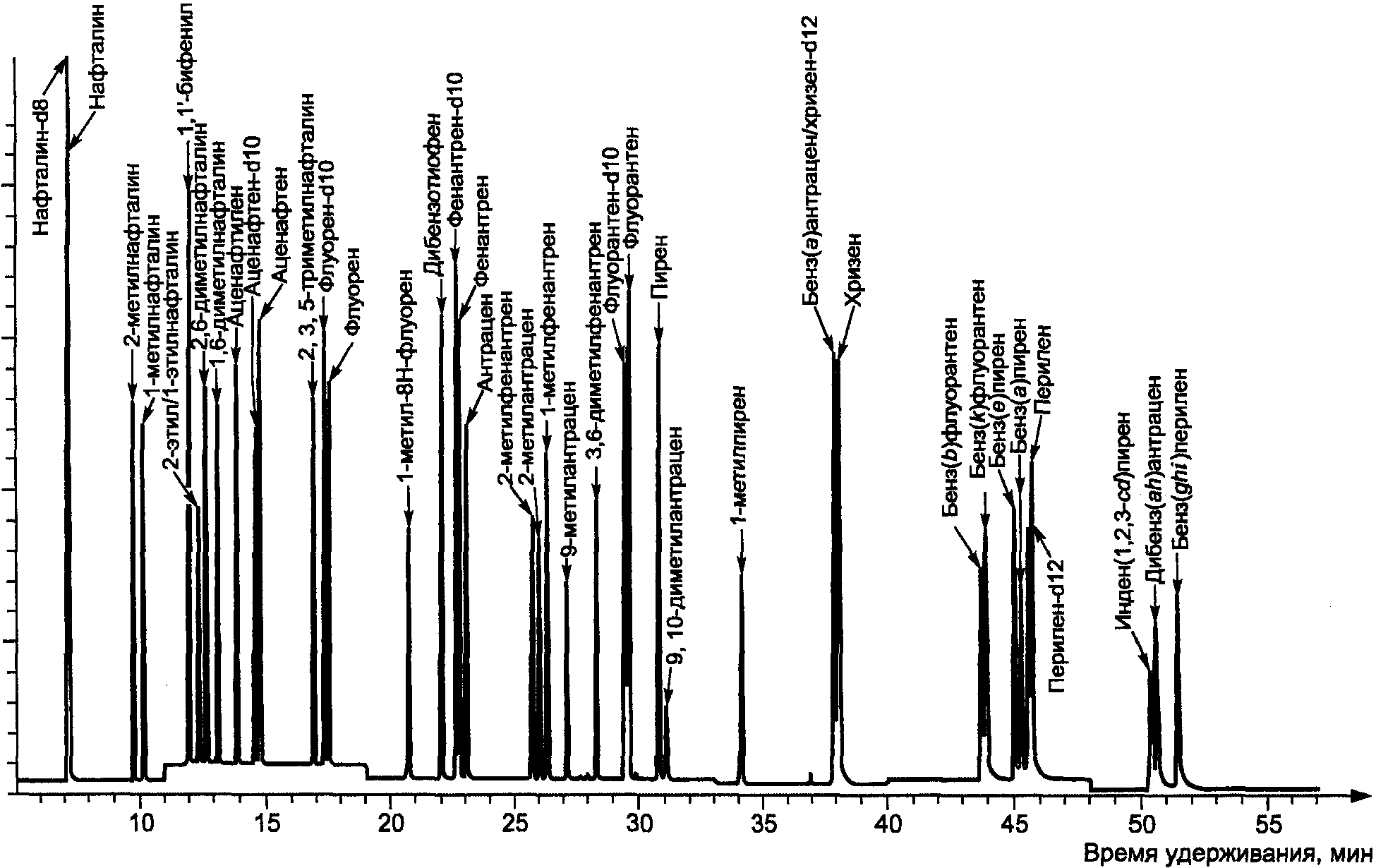 Степень мешающего влияния, которое может быть вызвано используемой газохроматографической аппаратурой, не была полностью оценена. Хотя приведенные условия ГХ-МС анализа обеспечивают достаточную разрешающую способность для обнаружения большинства ПАУ, некоторые изомеры ПАУ не могут быть разделены хроматографически, поэтому с помощью масс-спектрометрического анализа их также невозможно различить друг от друга. Мешающее влияние некоторых не-ПАУ соединений, особенно масел, а также некоторых полярных органических соединений можно снизить или исключить путем использования колоночной хроматографии для очистки проб перед проведением ГХ-МС анализа. Аналитическая система должна регулярно проверяться на отсутствие внутренних загрязнителей, таких как загрязненные растворители, стеклянная лабораторная посуда, реактивы, которые могут оказывать мешающее влияние. Каждая порция используемых реактивов должна быть проверена на отсутствие загрязнителей с использованием контрольных лабораторных реактивов.
