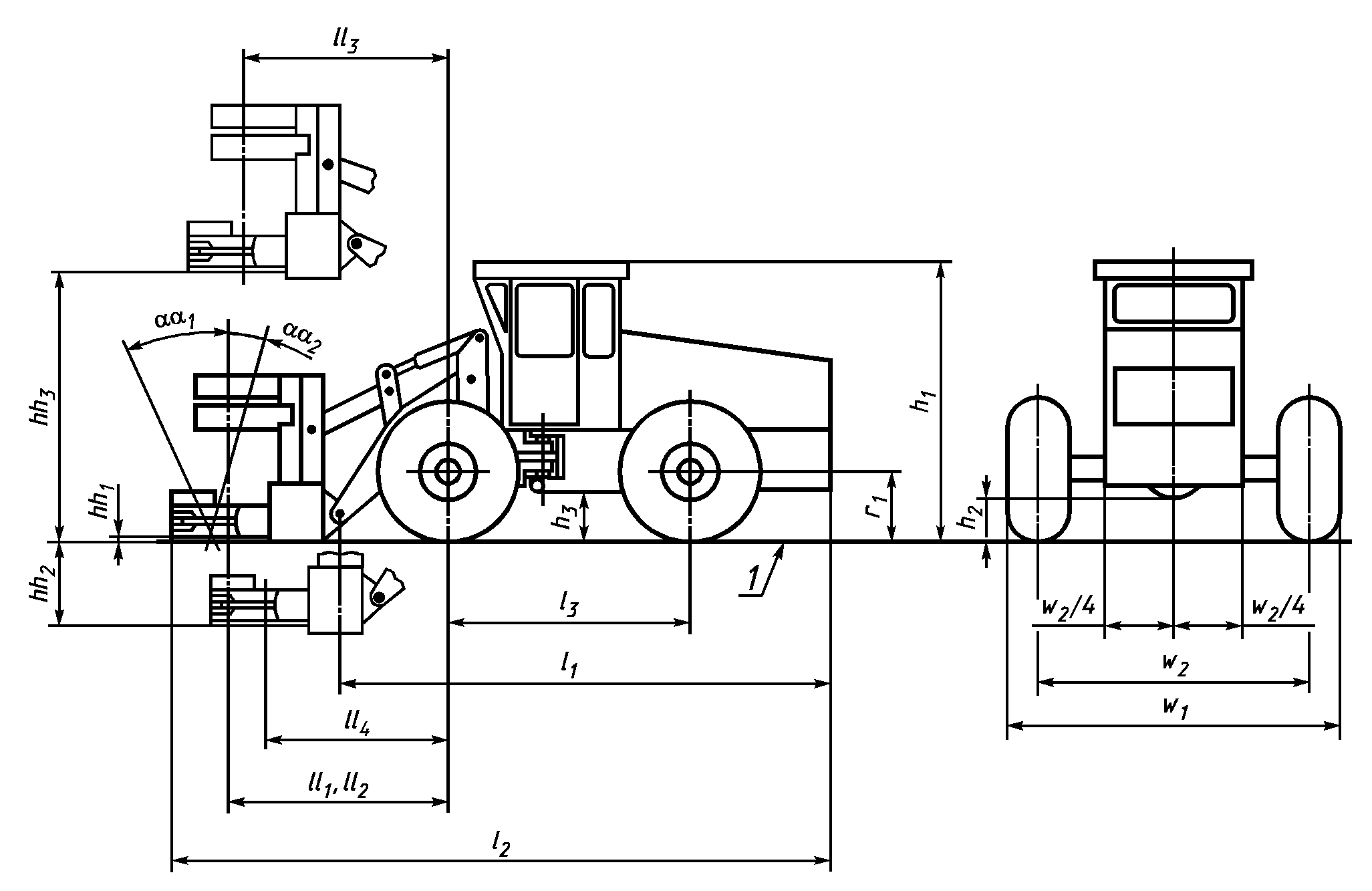 - расстояние по горизонтали между вертикальной плоскостью, проходящей через крайние задние точки ВПМ, и вертикальной плоскостью, проходящей через крайние передние точки валочной головки, полностью опущенной вниз (