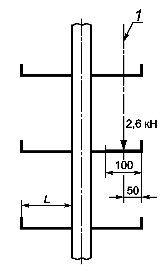 Расстояние L, которое следует учитывать при испытании на прочность и изгиб, должно быть самым большим расстоянием между двумя последовательными точками анкерного крепления лестницы (см. позицию 4 на