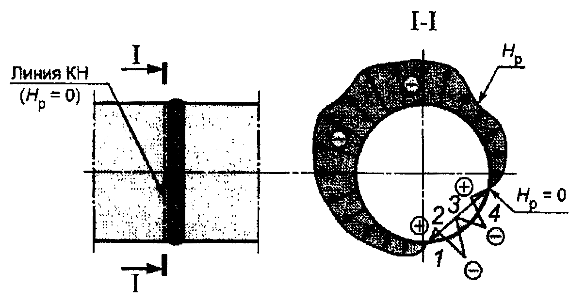 по периметру стыка с концентрацией остаточных напряжений КН (в зонах 1 - 4, по линии