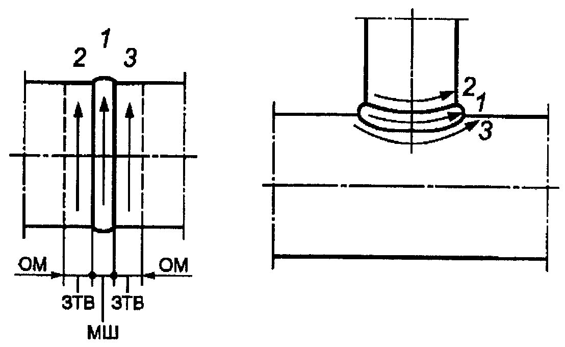 a - перемещение датчика вдоль сварного шва; b - перемещение датчика перпендикулярно к сварному шву; МШ - металл шва; ЗТВ - зона термического влияния сварного соединения; ОМ - основной металл; 1, 2, 3 - зоны контроля
