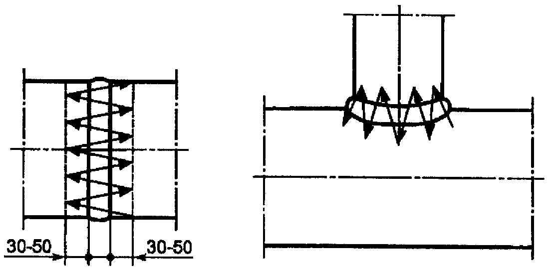 Феррозондовый преобразователь располагается перпендикулярно к поверхности контроля и перемещается оператором вручную последовательно вдоль сварного шва по всему периметру (отдельно по металлу шва и зонам термического влияния с обеих сторон шва) и затем перпендикулярно к сварному шву с отклонением от края шва на 30 - 50 мм в сторону основного металла трубы.