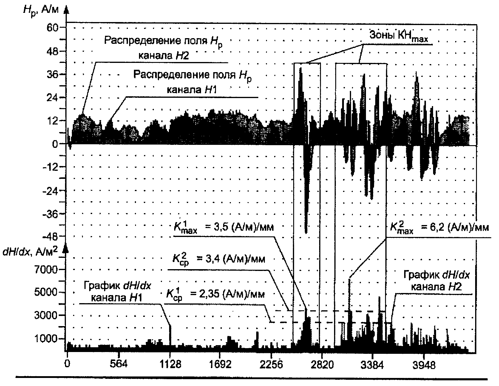 ) или максимальное значение градиента поля по любому из каналов измерений. Эти участки соответствуют ЗКН и дефектам сварного соединения. Для выявления конкретных дефектов в ЗКН проводят дополнительный контроль традиционными методами (УЗД, рентген и т.д.).