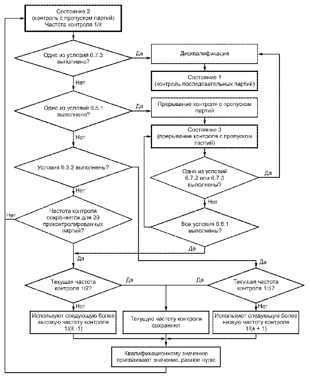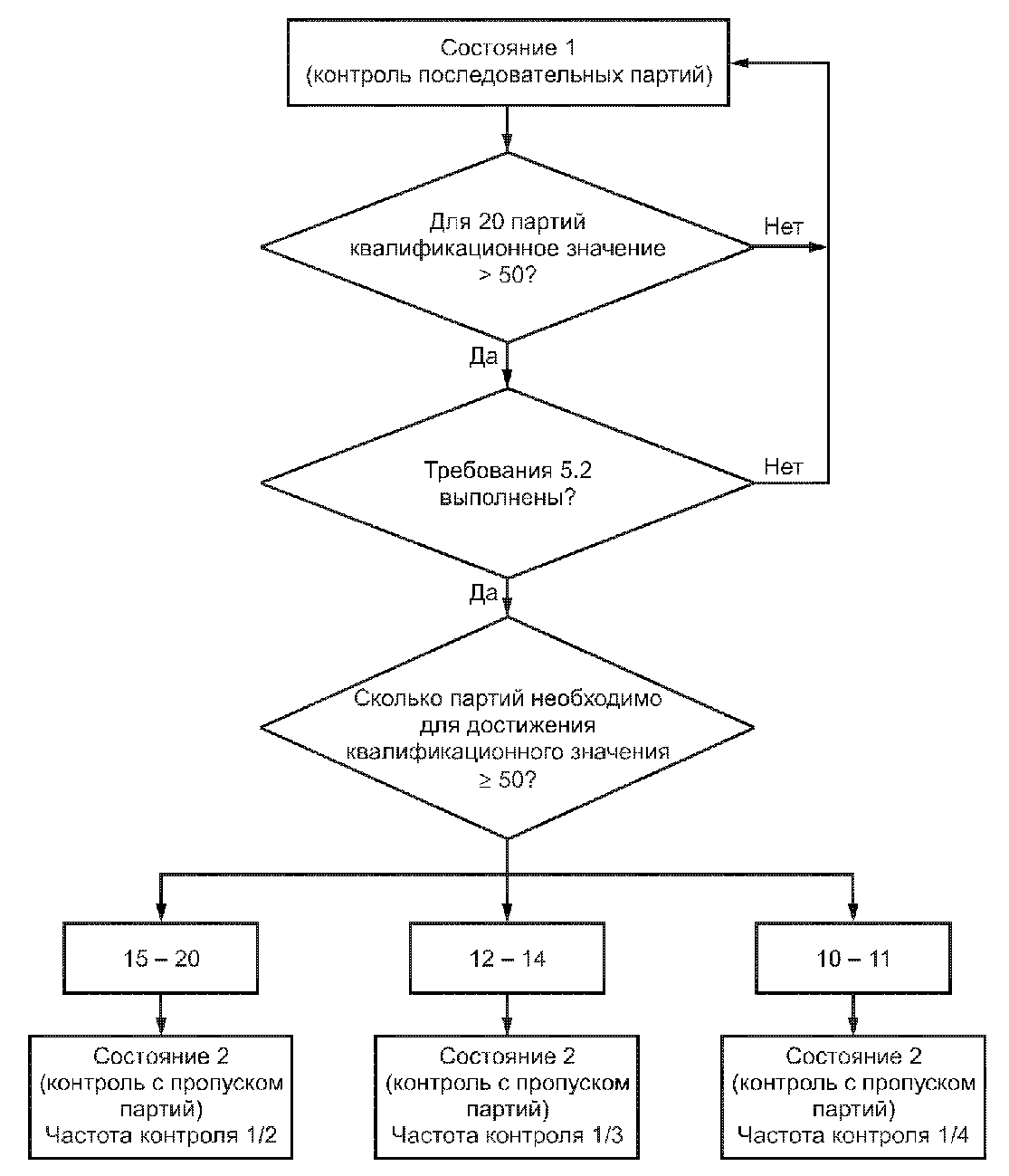 Примечание. Партии для контроля выбирают случайным образом в соответствии с установленной частотой контроля с пропуском партий. Например, частота контроля с пропуском одной партии из двух означает, что за длительный период средняя доля контролируемых партий составляет 1/2.