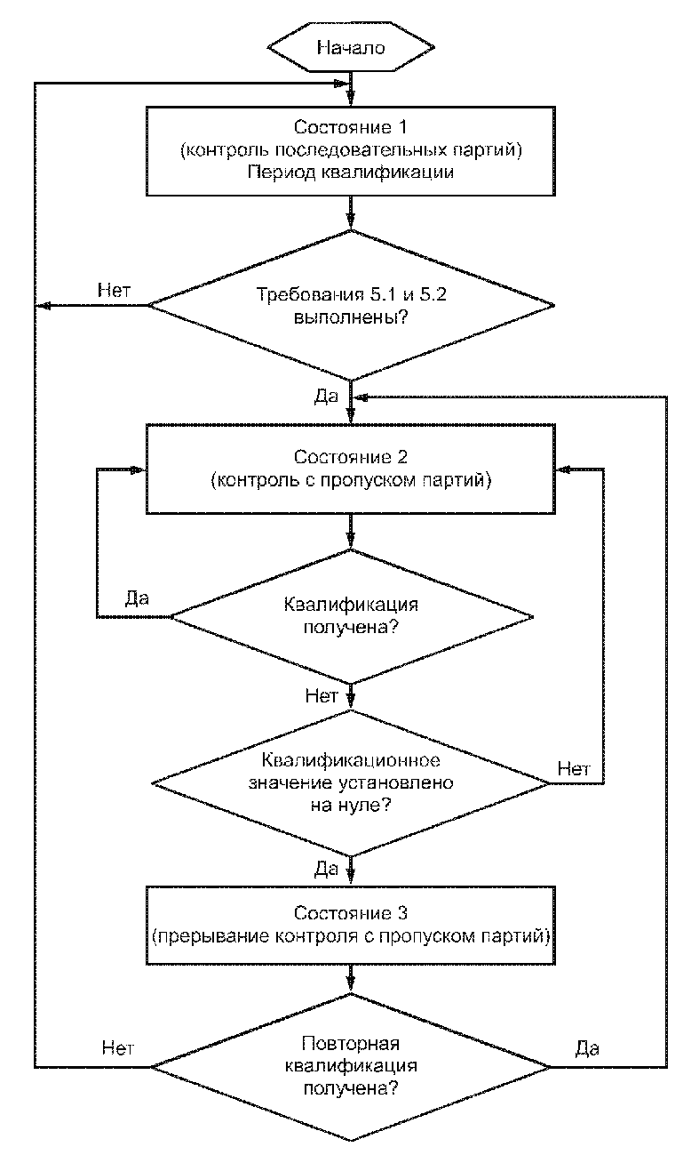 Примечание 2. В соответствии с настоящим стандартом контроль последовательных партий используют как в состоянии 1 (период квалификации), так и в состоянии 3 (прерывание контроля с пропуском партий) (см.
