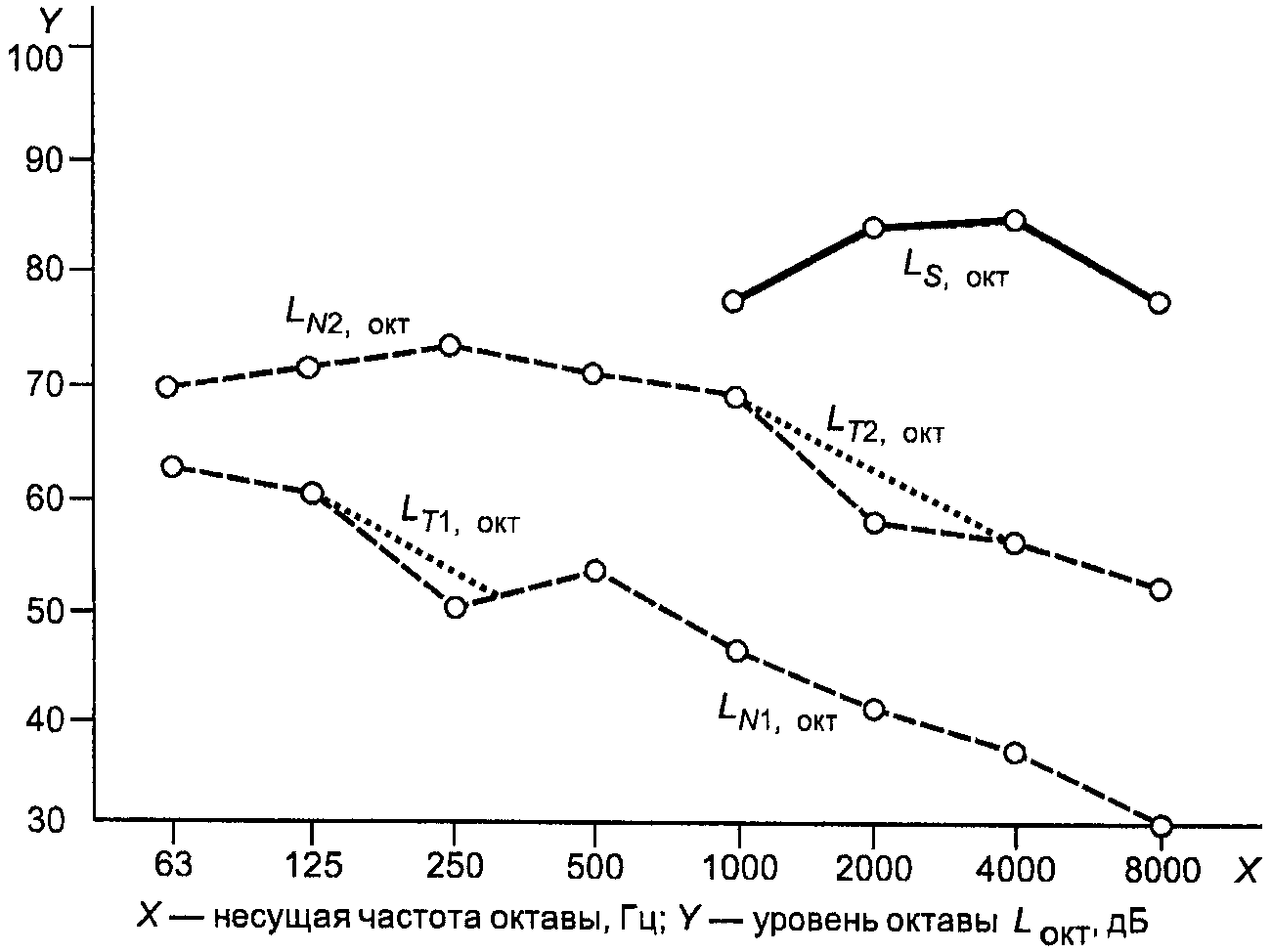 В следующих примерах сплошными линиями показан спектр сигнала опасности LS, штриховыми линиями обозначен спектр окружающего шума LN и пунктирными линиями показан эффективный маскирующий предел LT там, где он отличается от спектра шума.