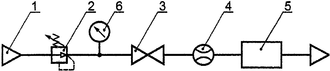 (рисунок 1) через редуцирующий клапан, политетрафторэтиленовую трубку (ПТФЭ) и соединение из ПТФЭ или нержавеющей стали, в зависимости от ожидаемых газовых загрязнений. Трубопровод должен быть защищен от возможного образования конденсата. Контейнер должен иметь вентиляционный клапан для продувки. До начала отбора пробы следует в течение 5 мин. выполнять продувку воздухом, находящимся в тестируемой системе. Переполнение контейнера не допускается. Размер контейнера должен соответствовать объему пробы. Повторное использование контейнера допускается только в том случае, если это предусмотрено изготовителем.